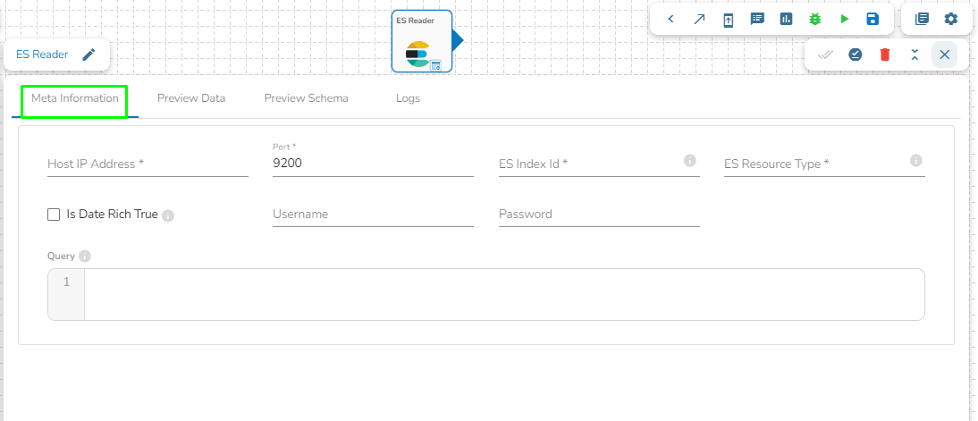 Drag the ES reader task to the Workspace and click on it to open the related configuration tabs for the same. The Meta Information tab opens by default.