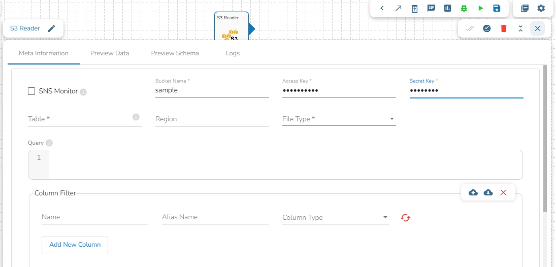 Drag the S3 reader task to the Workspace and click on it to open the related configuration tabs for the same. The Meta Information tab opens by default.
