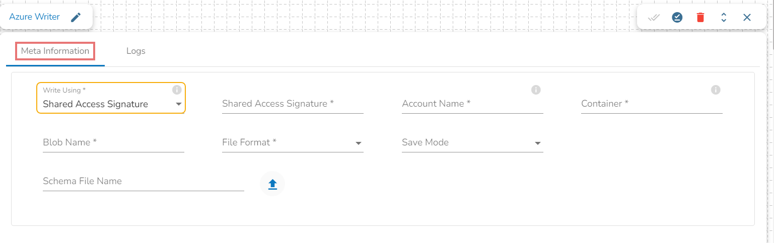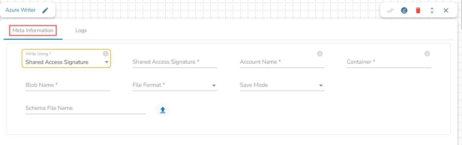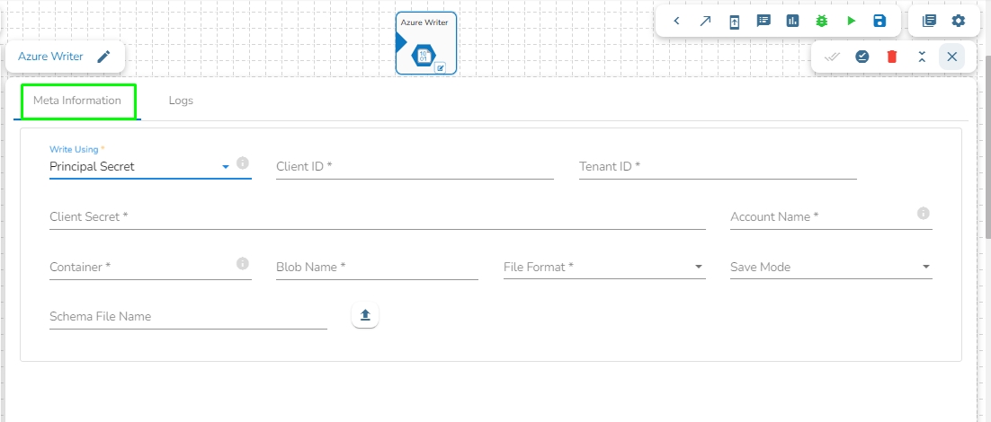 Drag the Azure writer task to the Workspace and click on it to open the related configuration tabs for the same. The Meta Information tab opens by default.
