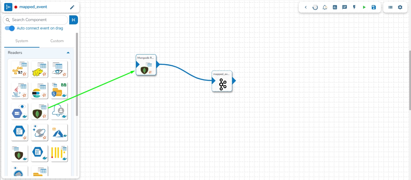 Once dragged and dropped to the pipeline workspace, components can be directly connected to the nearest Kafka Event. To enable the auto-connect feature, the user needs to ensure that the Auto connect event on drag option is enabled, which is the default setting.