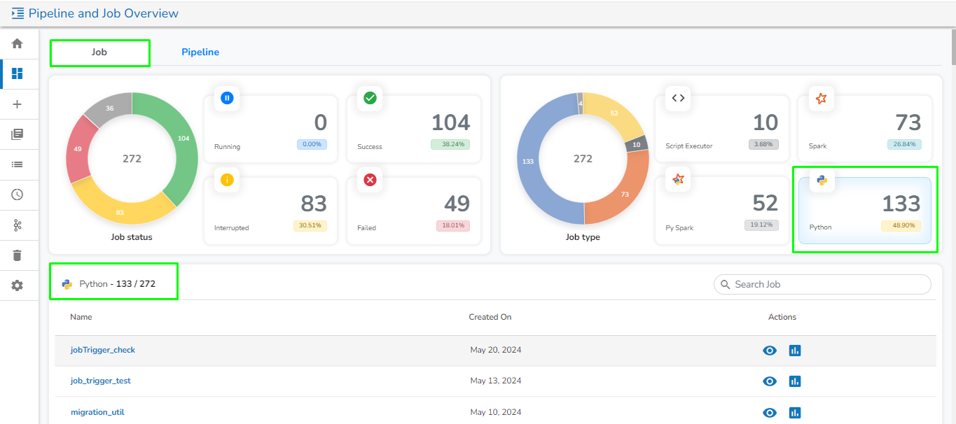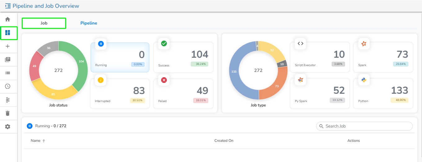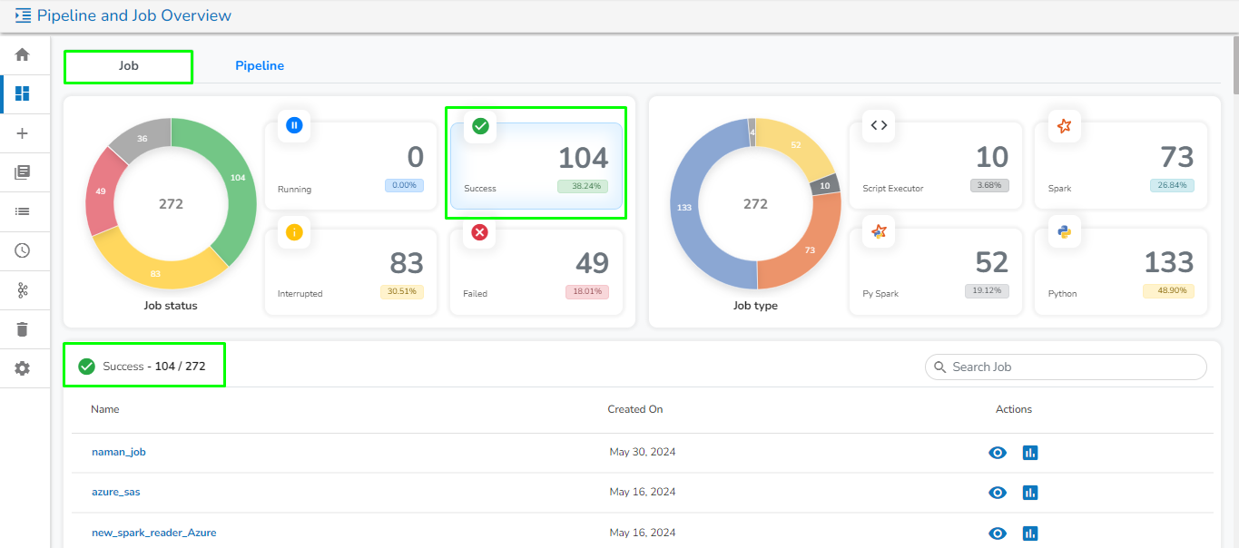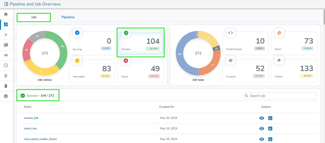 This tab will open by default once the user navigates to the Pipeline and Job Overview page. It contains the following information of the Jobs in graphical format: