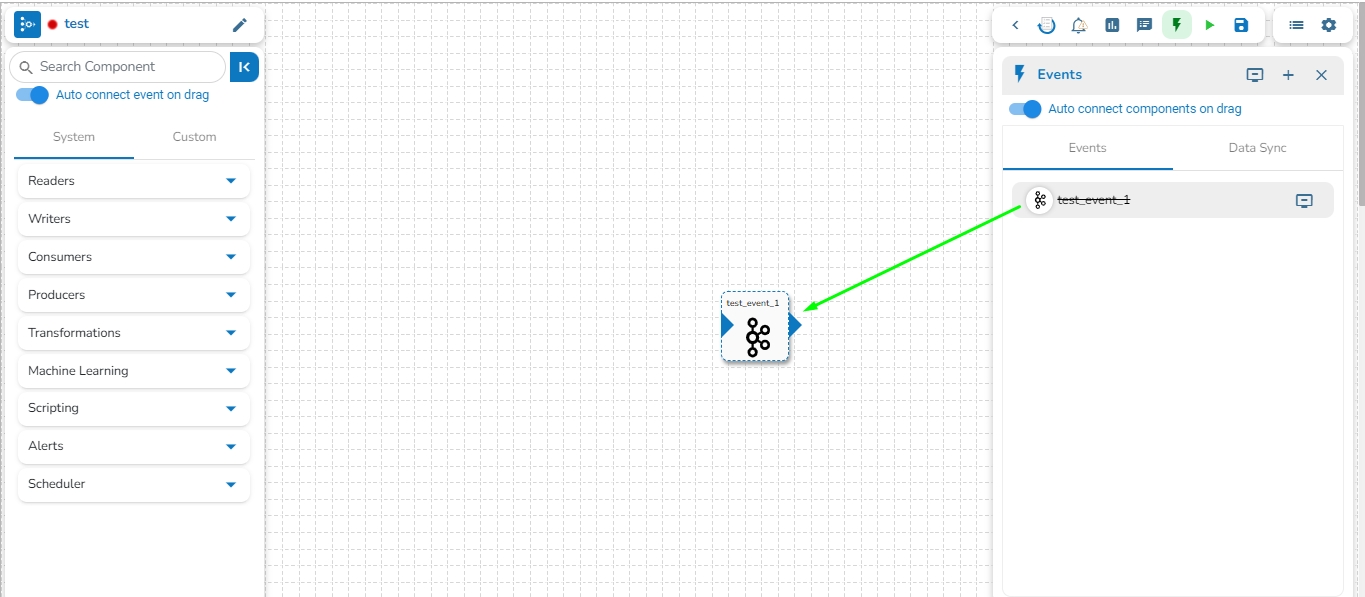 Connect the dragged component to the dragged Event to create a pipeline flow of data.