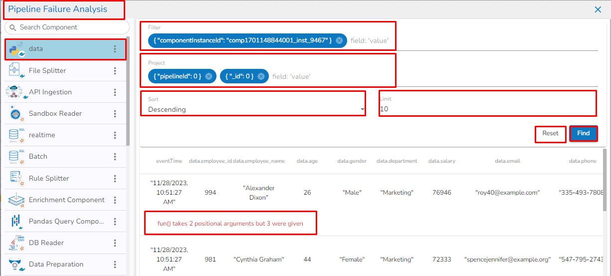 Filter: By default, the selected component instance Id will be displayed in the filter field. Records will be displayed based on the instance id of the selected component. It filters the failure data based on the applied filter.