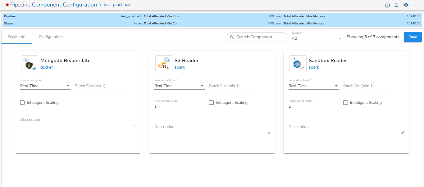 * In the ***Basic Info*** tab, the user can configure **basic information** for the components such as **invocation type, batch size, description**, or **intelligent scaling**.