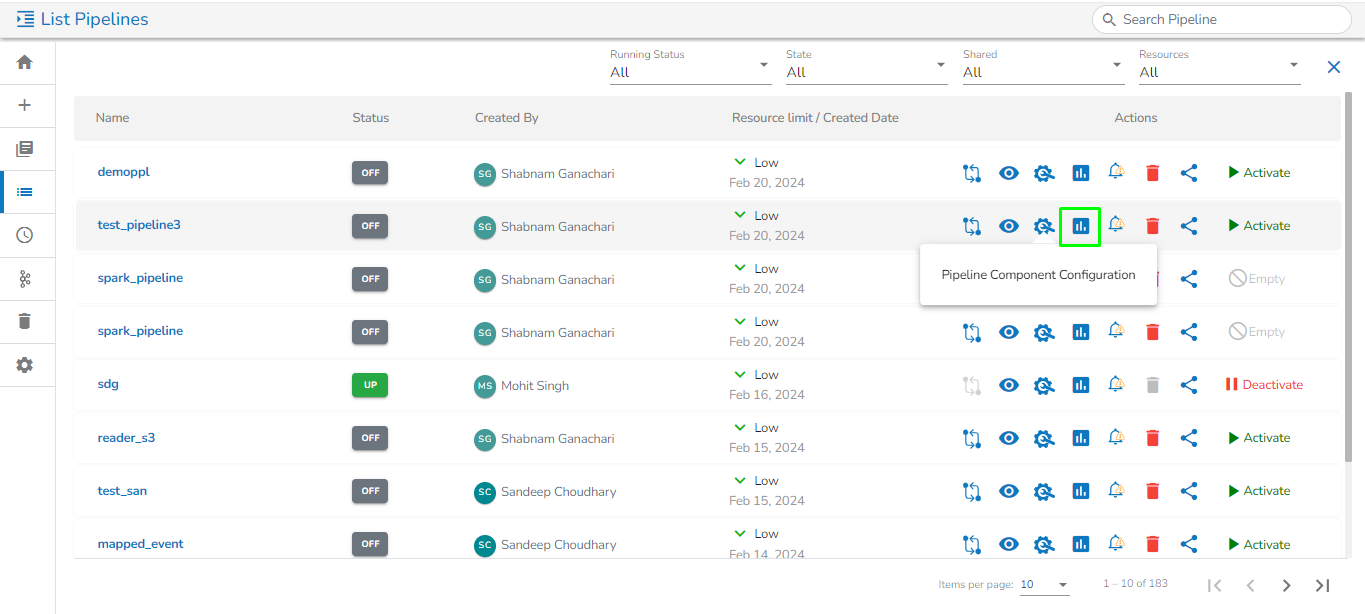 * **Status:** It indicates the running status of the pipeline. '***True***' indicates the Pipeline is active, while '***False***' indicates inactivity.