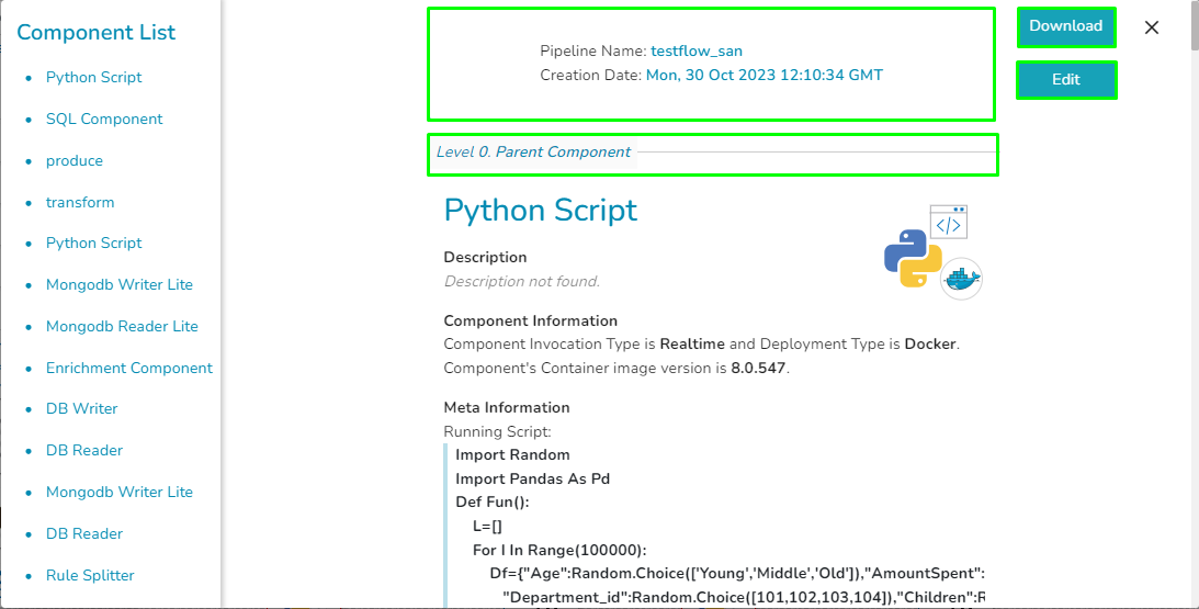 • Download: The Download option enables users to download all the information related to the pipeline. This comprehensive download includes details such as all components used in the pipeline, meta information, resource configuration, component deployment type, and more.