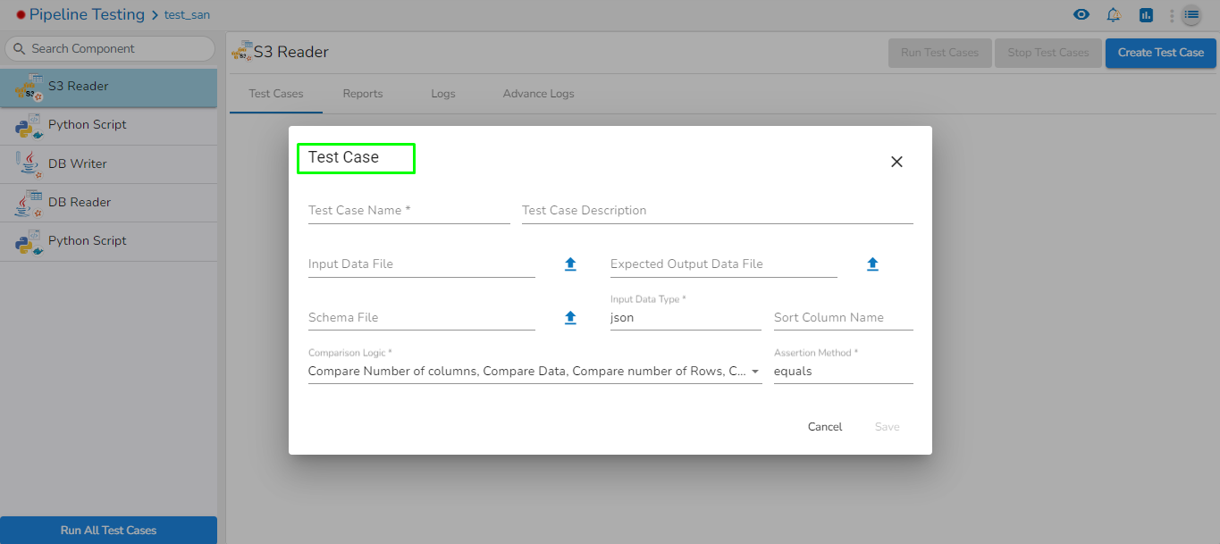 The Test suite module helps the developers to create a unit test for every component on the pipeline. We can upload input data and expected output data for every test case this will be then compared with the actual output generated by the component.