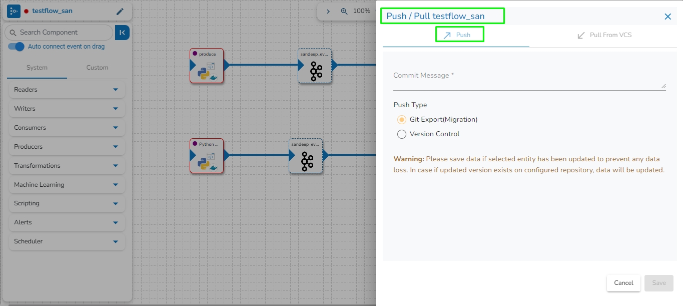 2.GIT Export (Migration): This is for pipeline migration. The pushed pipeline can be migrated to the destination environment from the migration window in Admin Module.