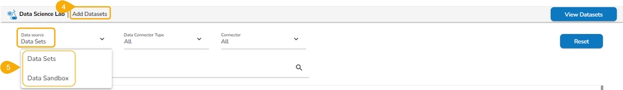 Data is the first requirement for any Data Science Project. The user can add the required datasets and view the added datasets under a specific Project by using the Dataset tab.