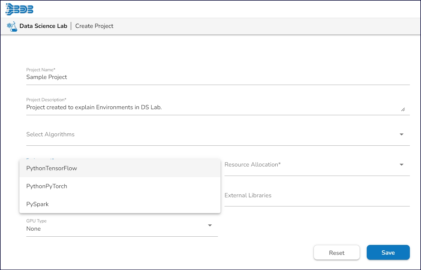 Allows users to select the environment they want to work in. Currently, supported Python frameworks are Sklearn (default), TensorFlow, PyTorch and PySpark.