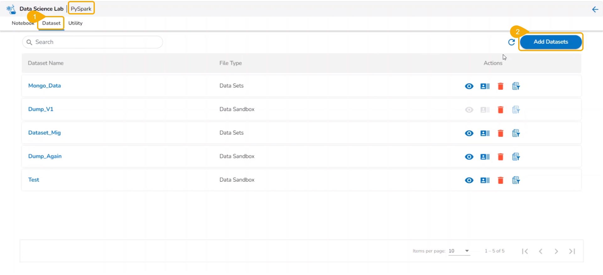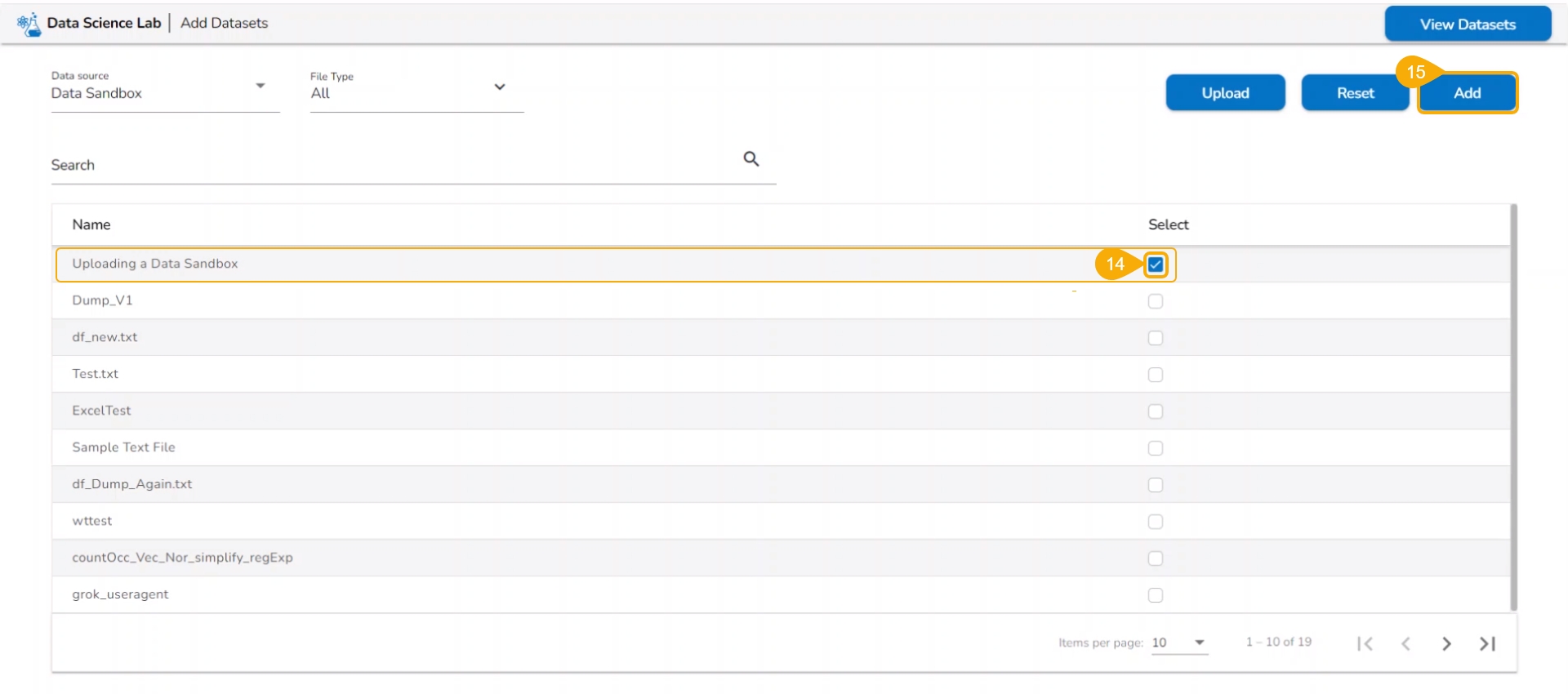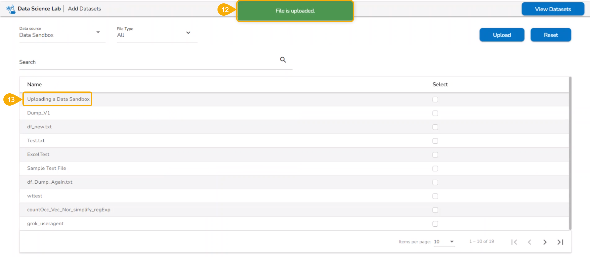 The user gets redirected to the Add Datasets page displaying the recently uploaded Sandbox file at the top of the list.