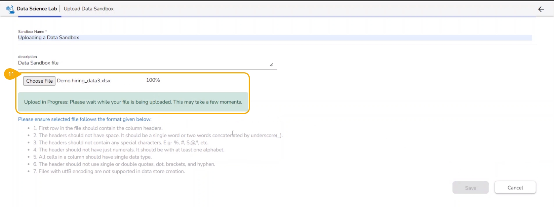 Click the Upload option to upload a Data Sandbox file.