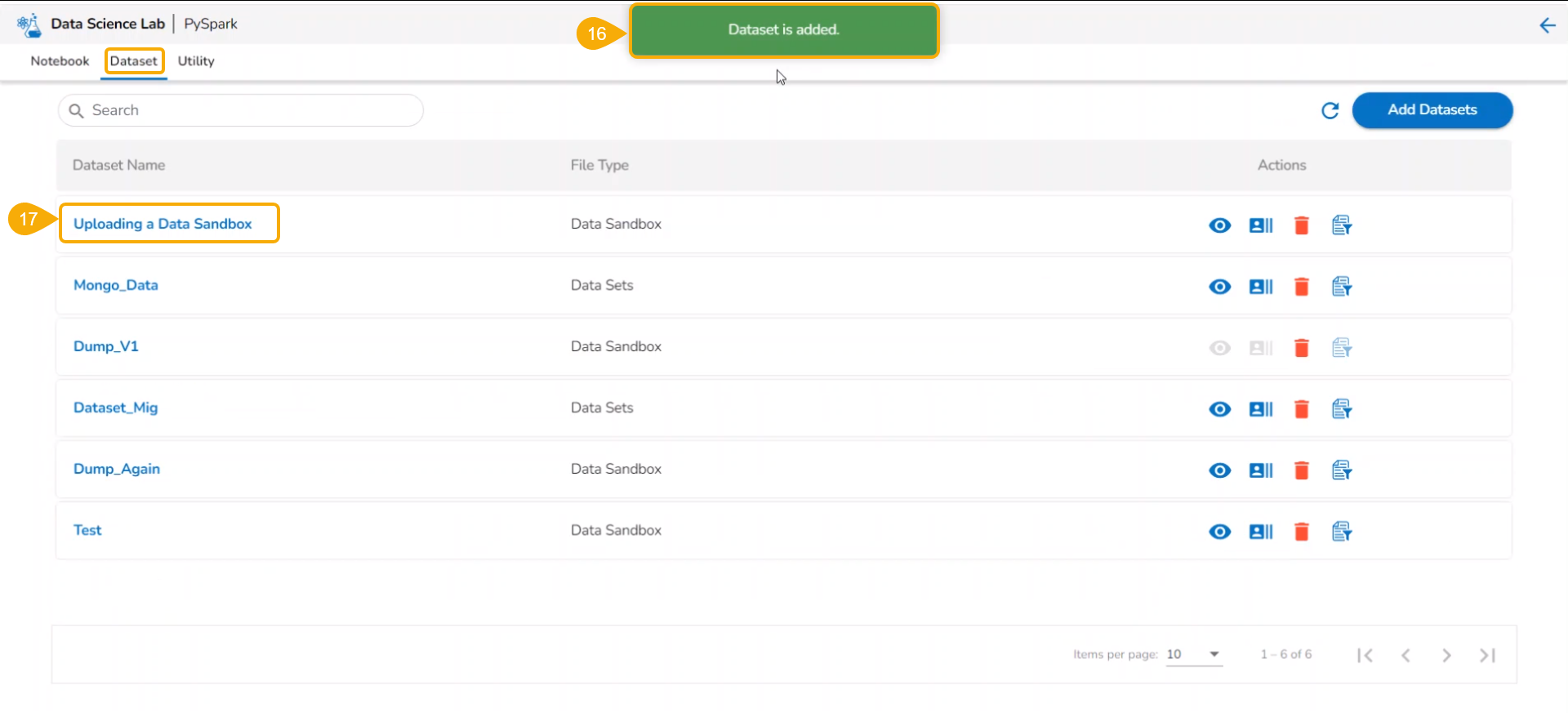 The user gets redirected to the Dataset tab where the uploaded Sandbox file is added file at the top of the list.