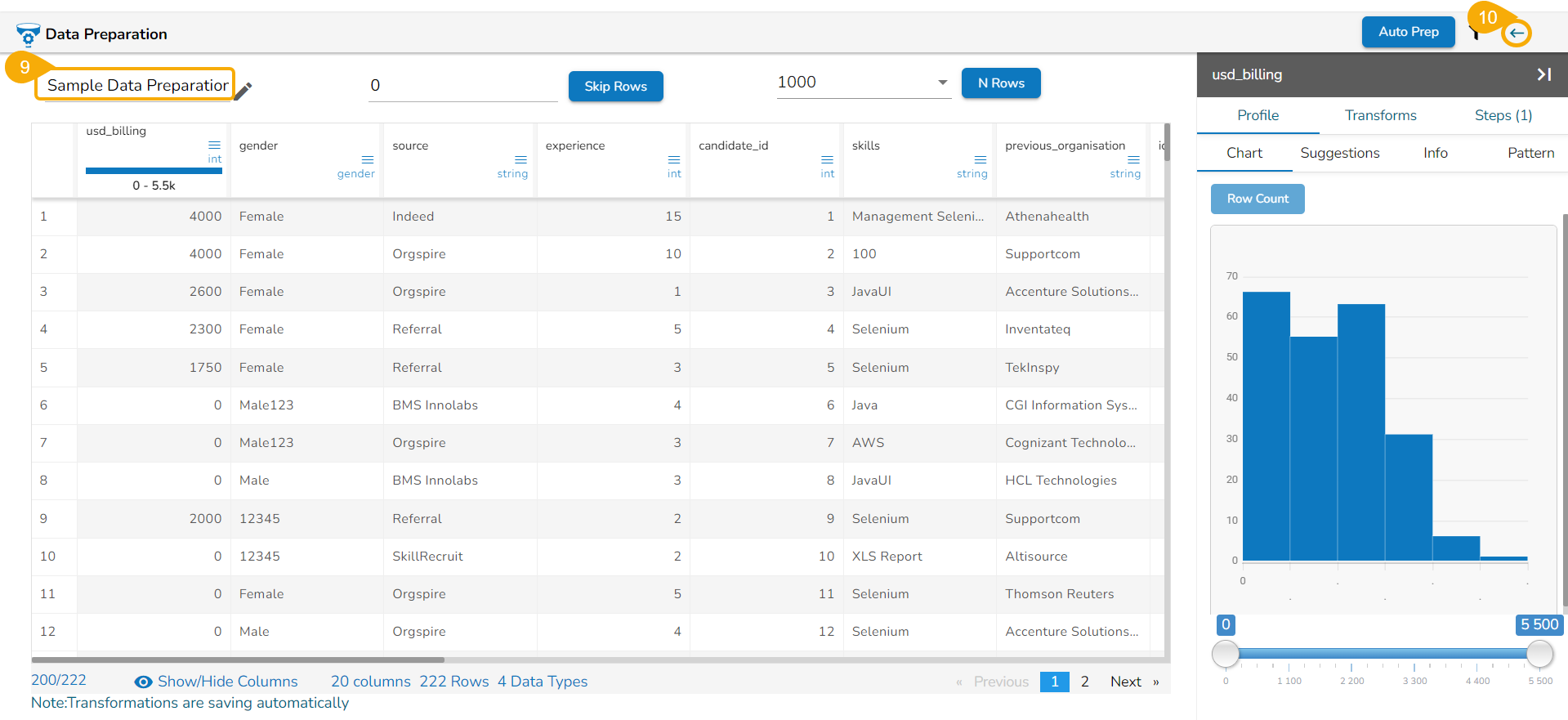 Apply the required transforms on the data set. E.g., Auto Prep option is applied on the displayed Dataset (The user can also use any transformation using the Transforms tab).