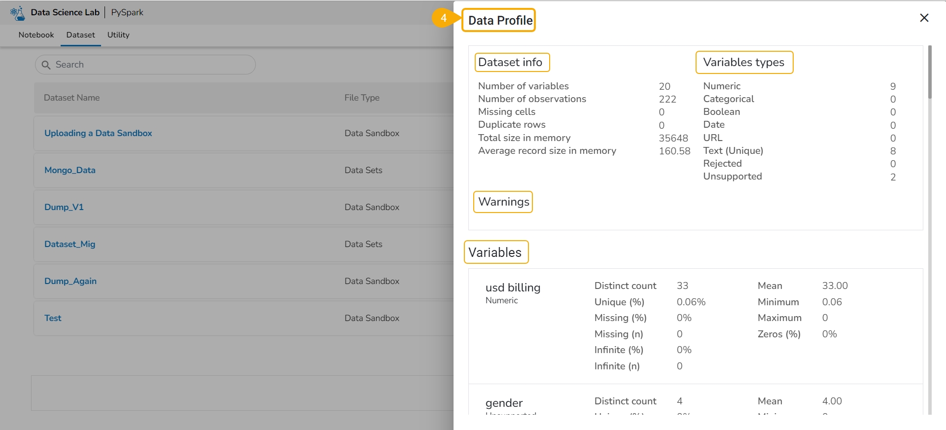 The Data Profile page opens displaying the Data Set information, Variable Types, Warnings, Variables, Correlation chart, missing values, sample.