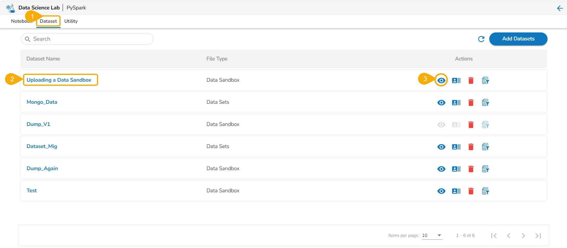 Navigate to the Dataset list inside a Project.