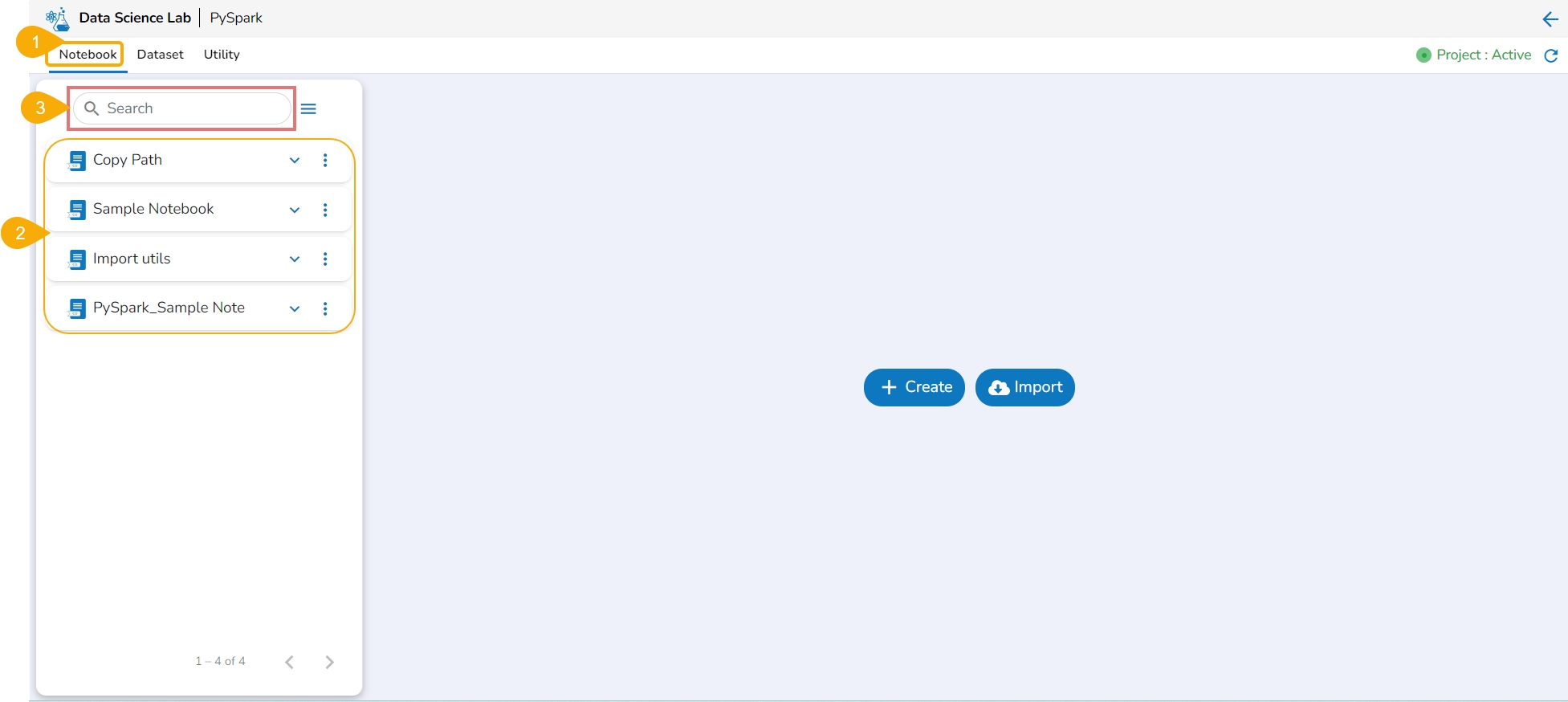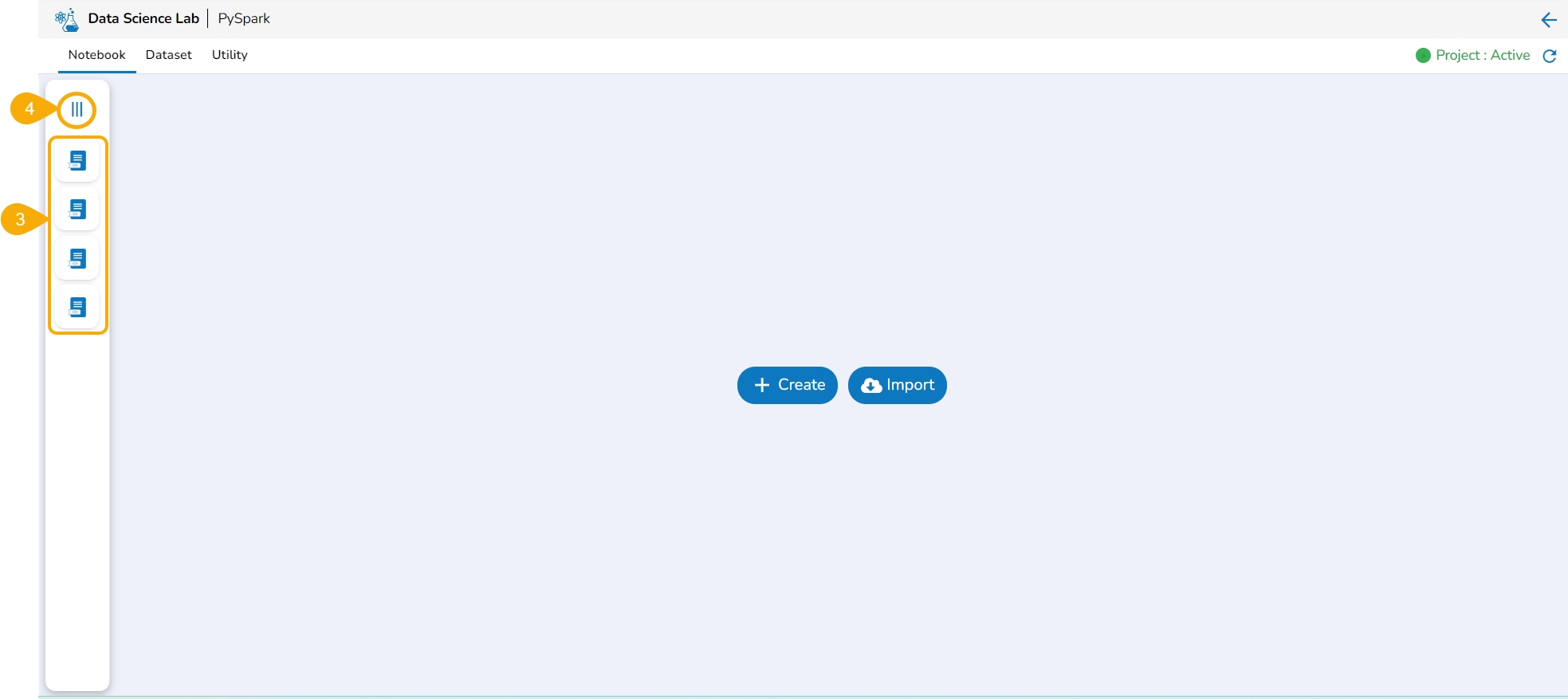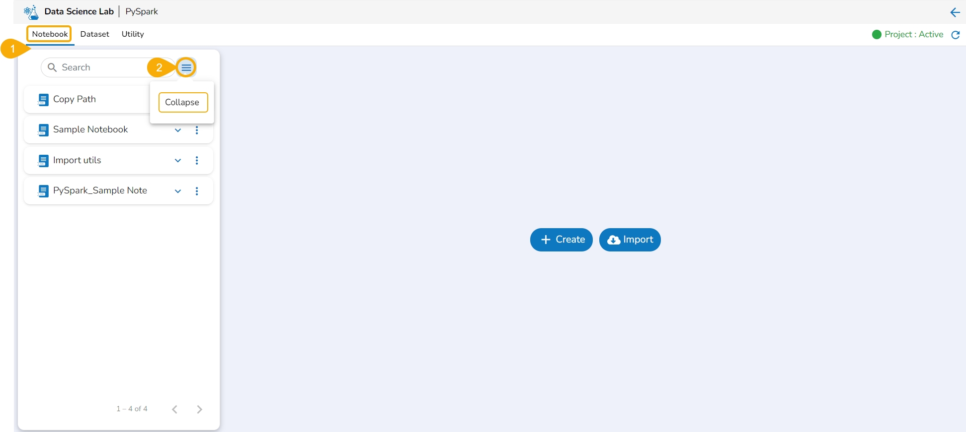 The Notebook List gets created on the left side of the Notebook interface. All the created and saved Notebooks will be listed here with Actions icons.