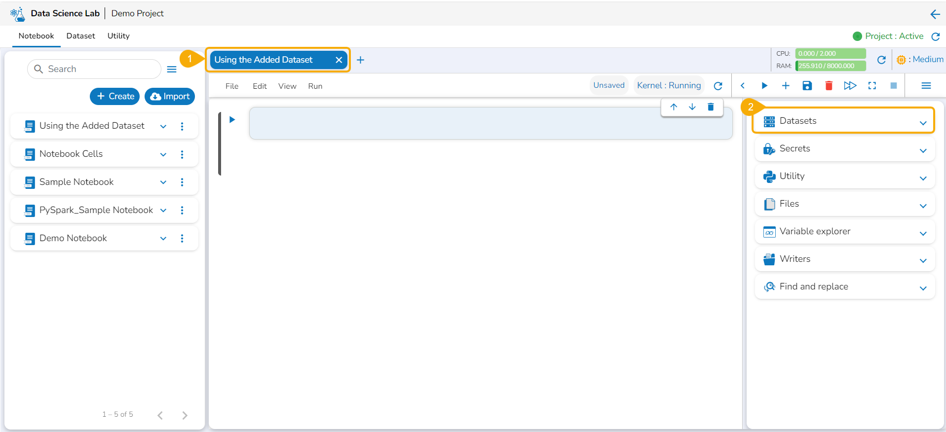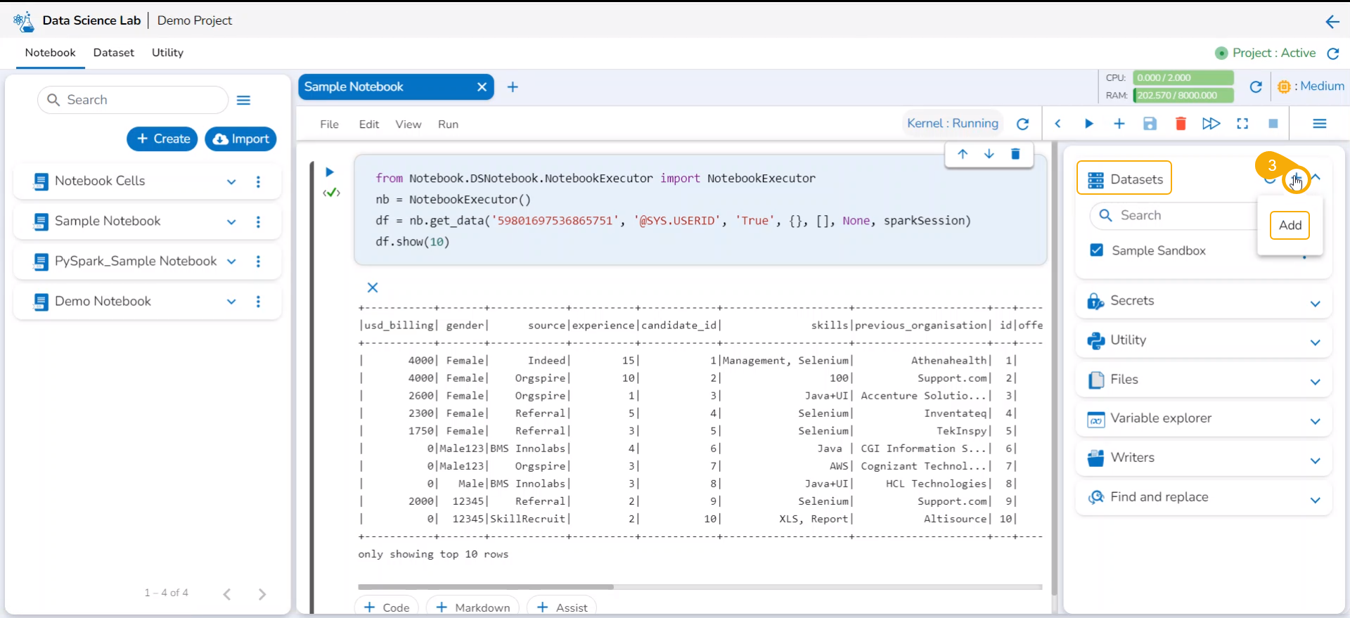 Now the Notebook page facilitates the user to add the datasets.