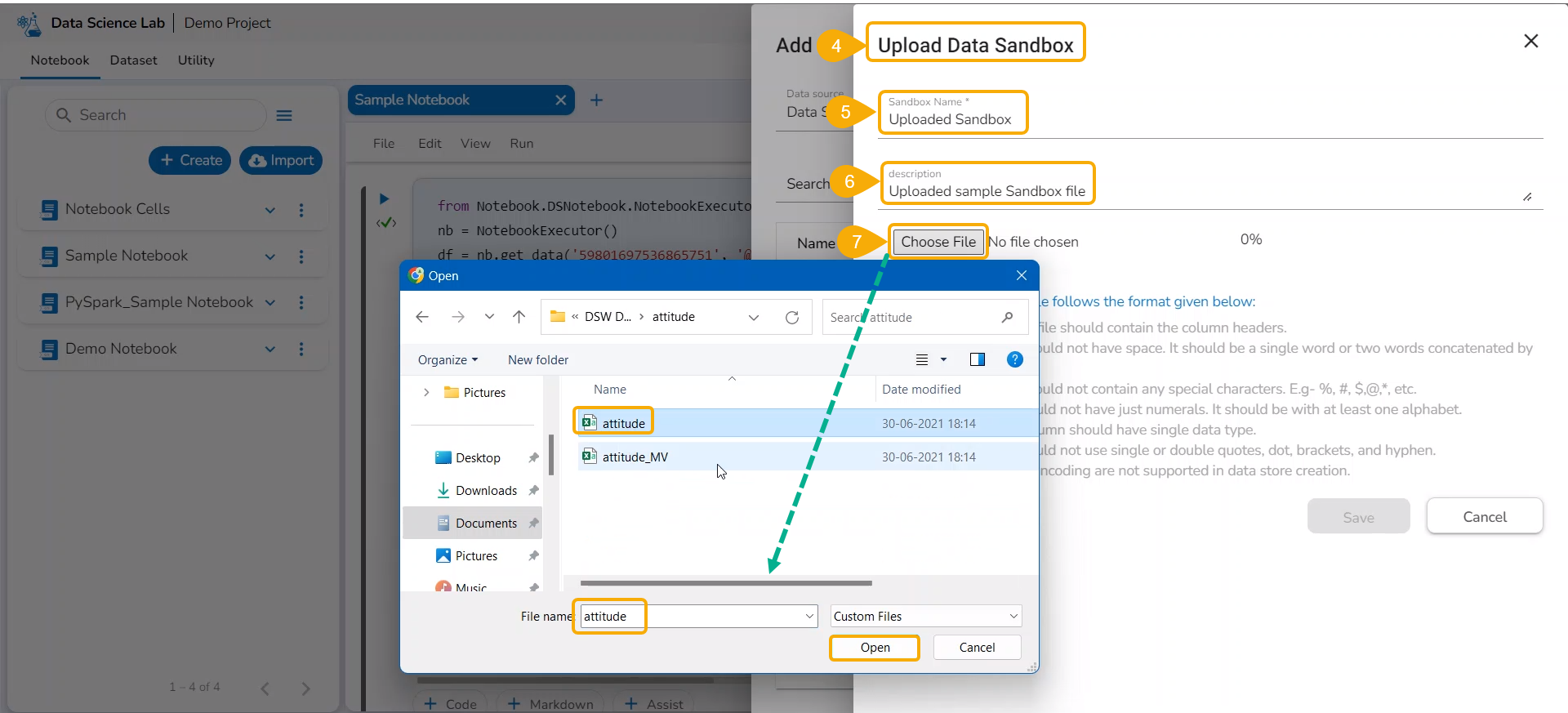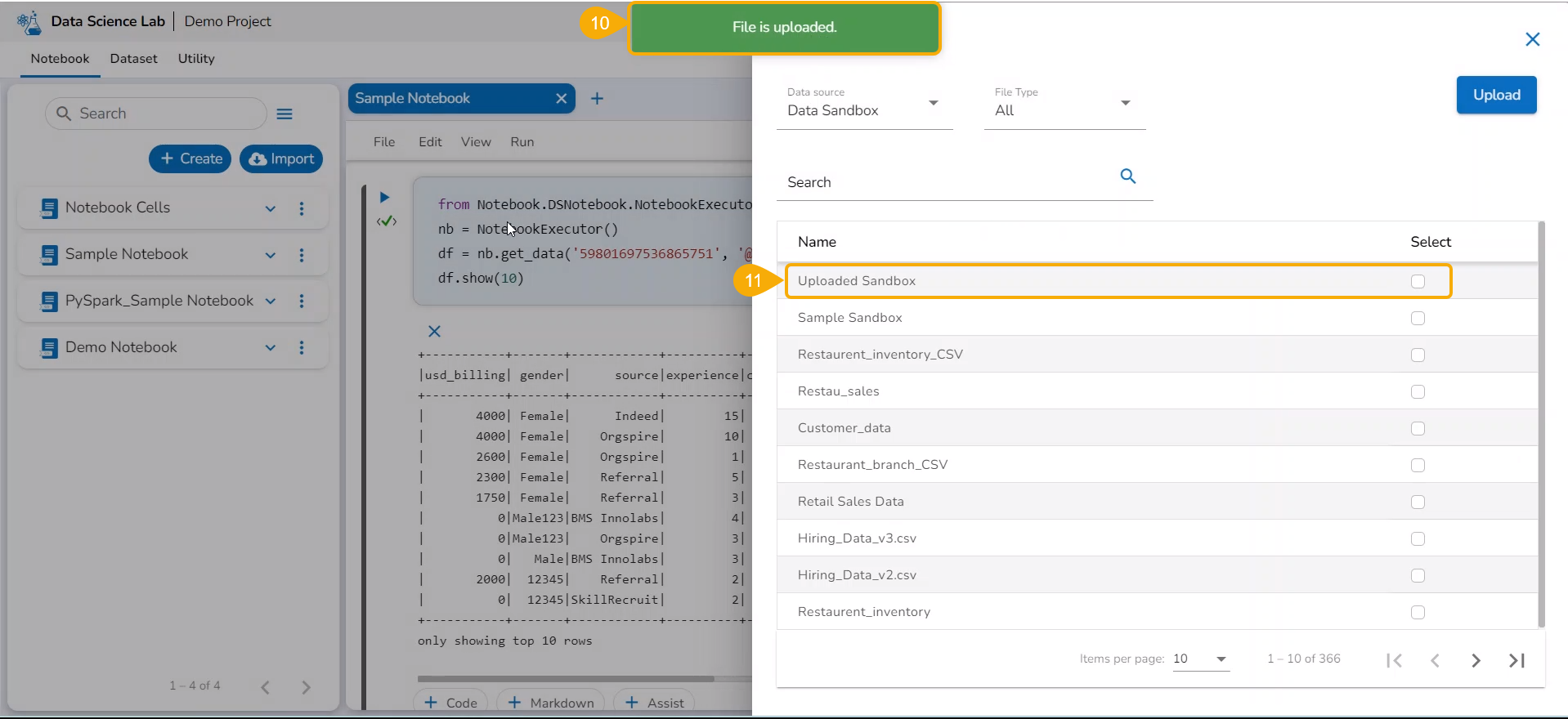 Please Note: The Upload option is provided for the Sandbox files inside the Data Science Notebook.
