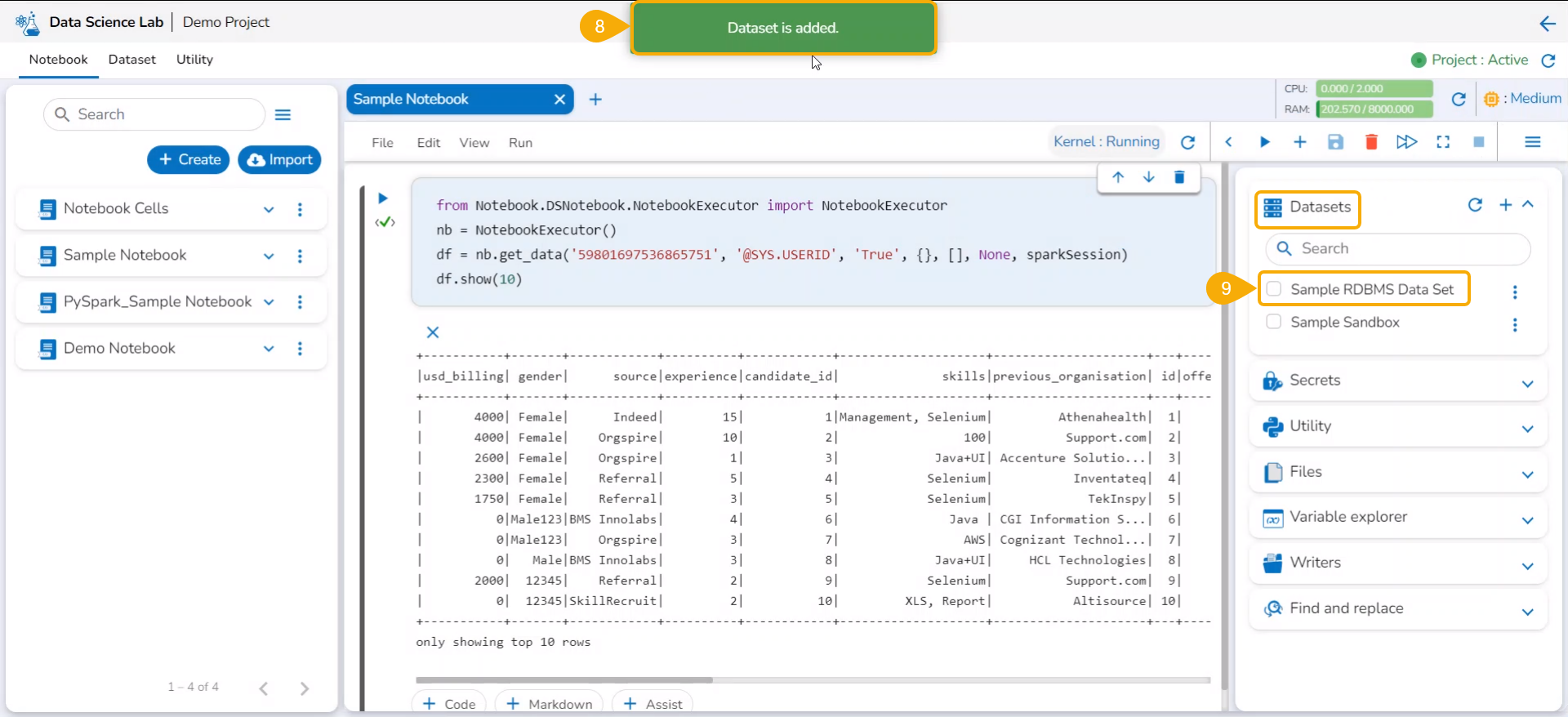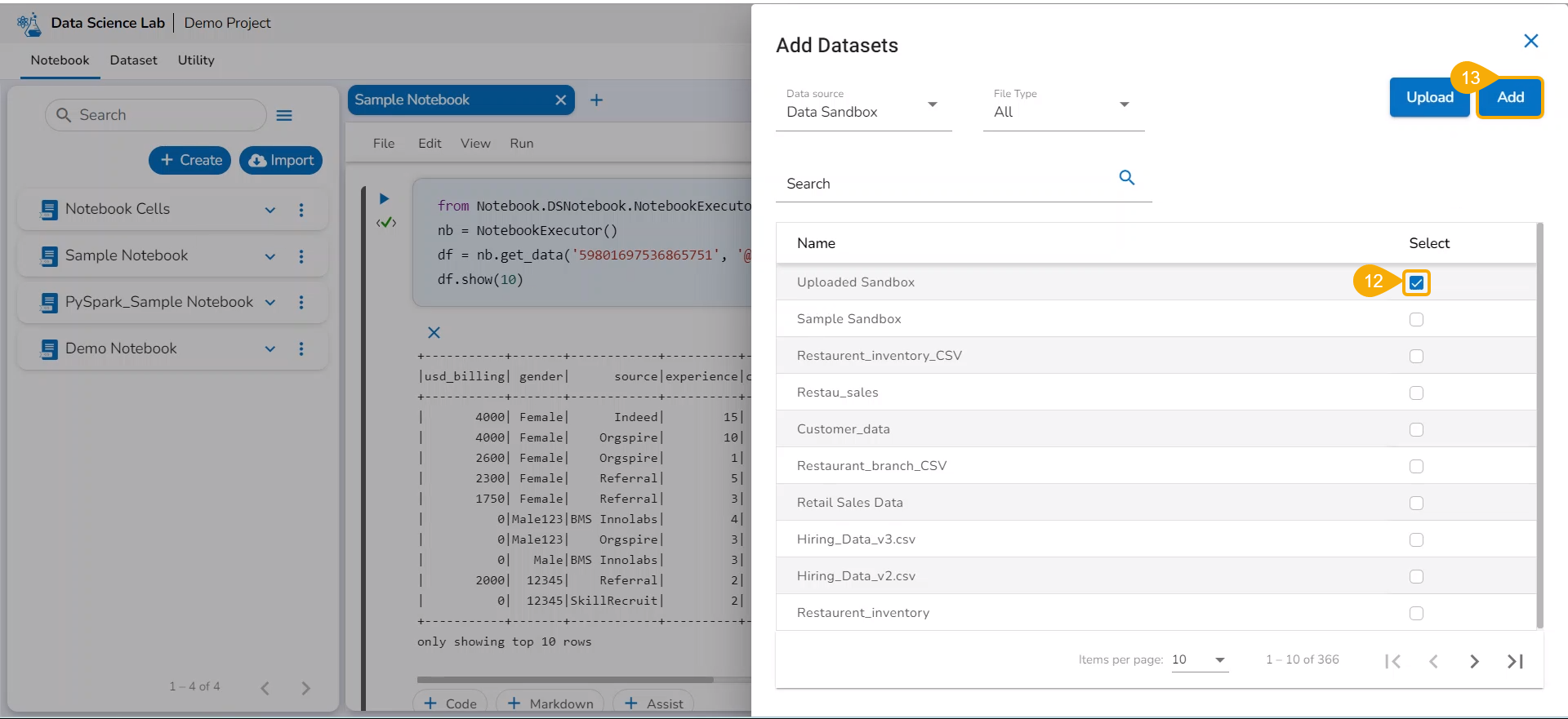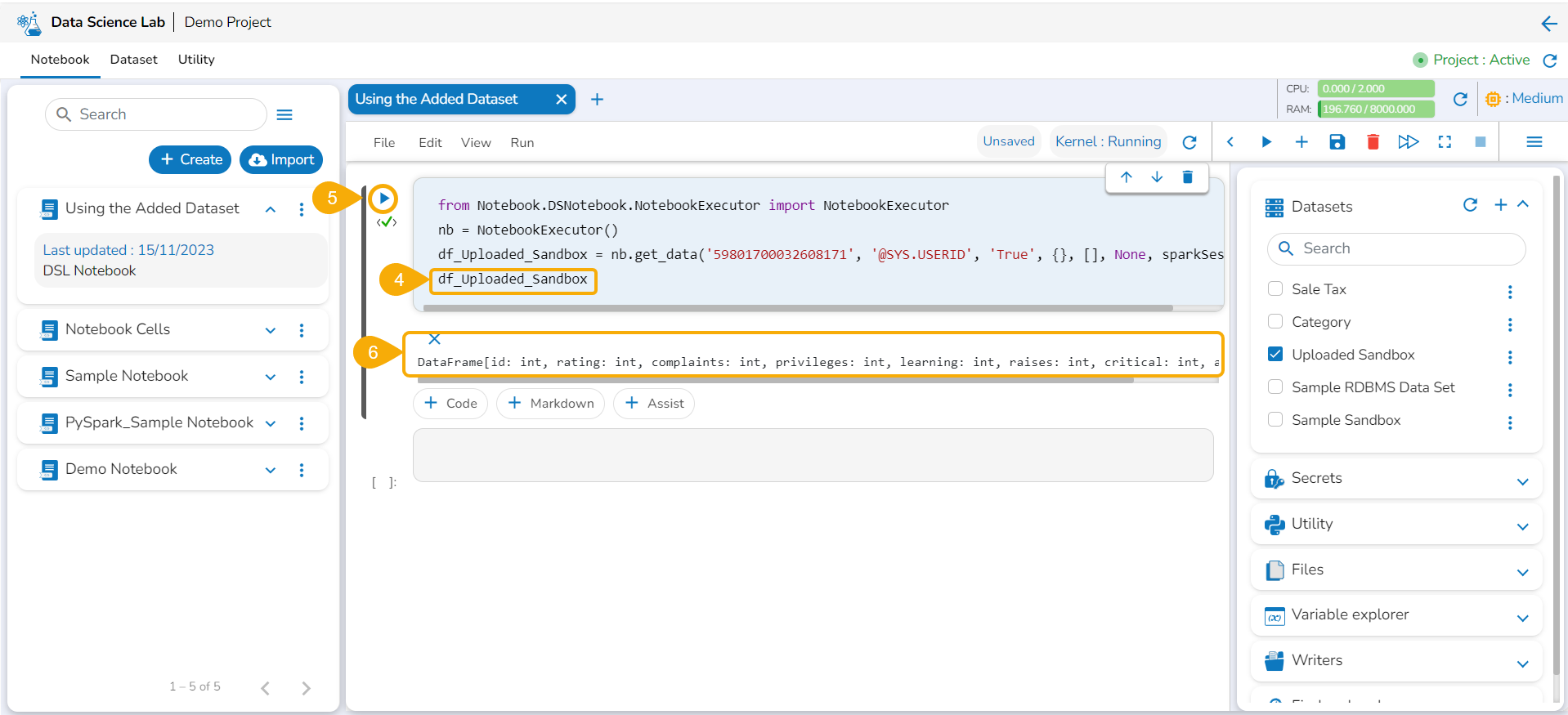 The uploaded Data Sandbox dataset gets added to the Notebook.