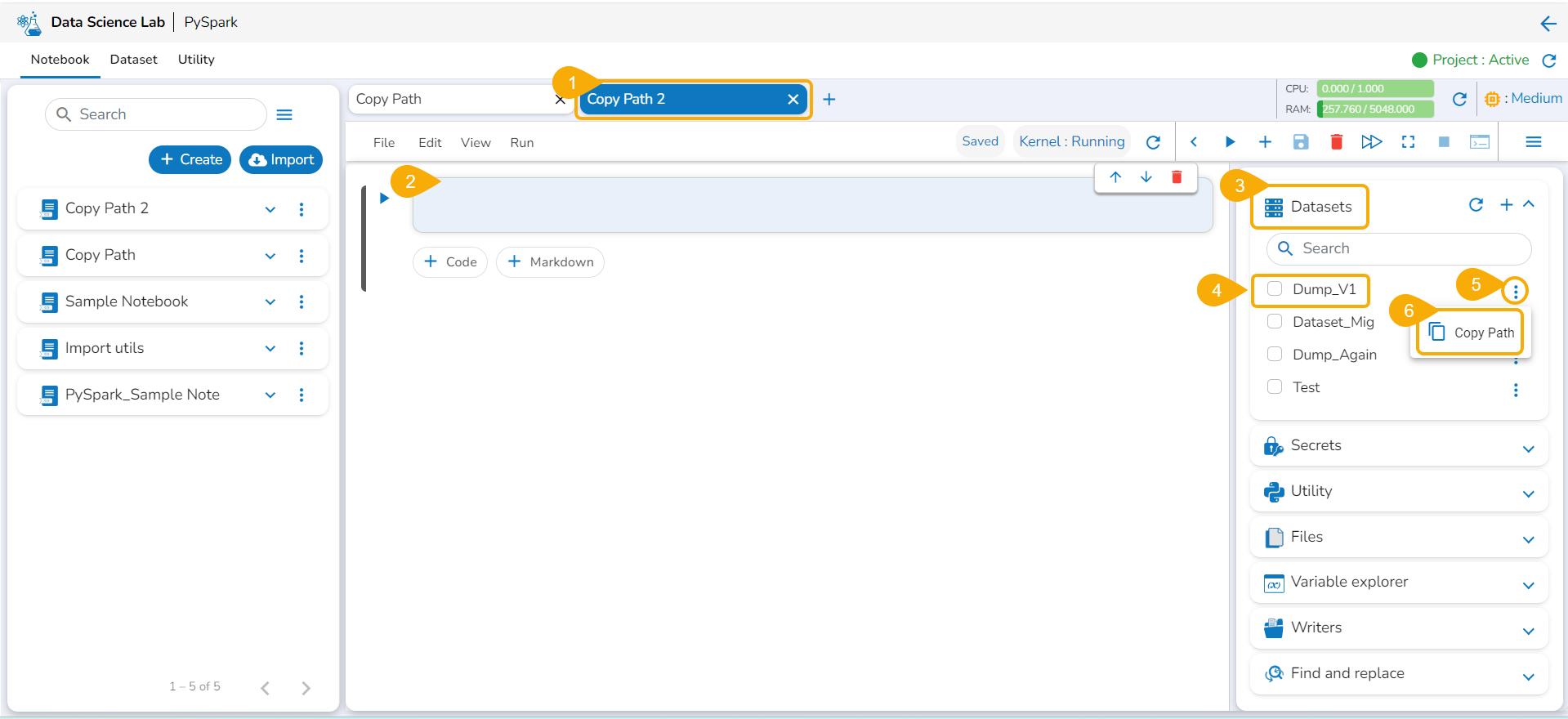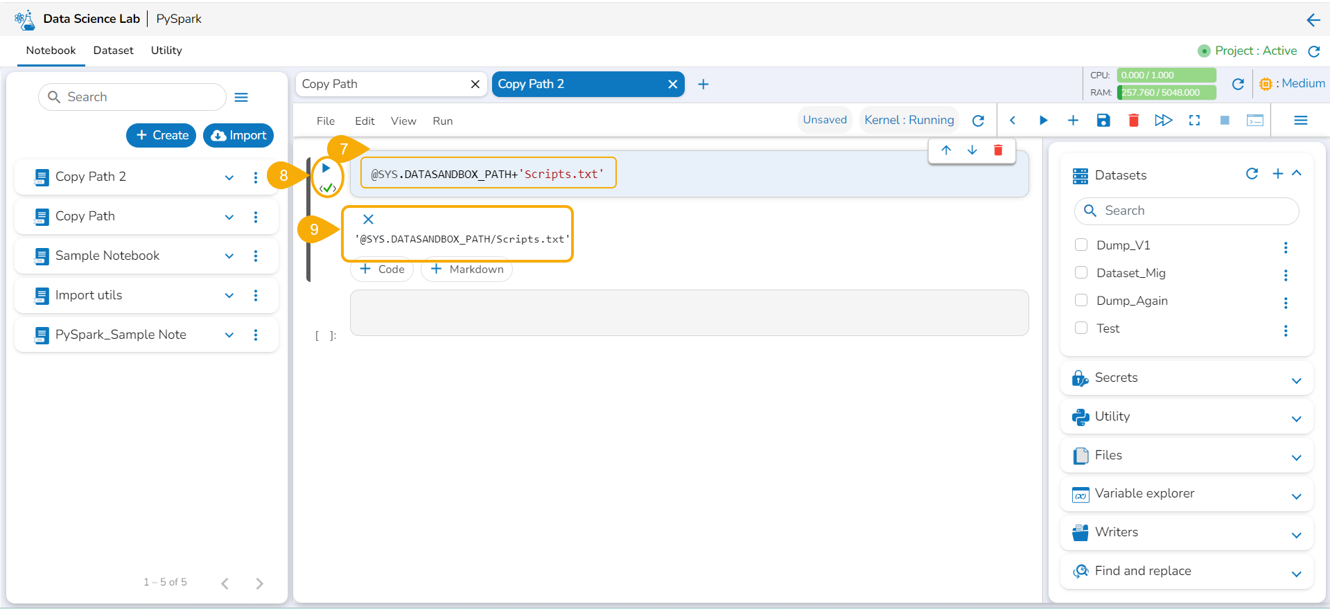 A file along with the Data Sandbox environment variable (@SYS.DATASANDBOX_PATH) can be generated with the Copy Path functionality and accessed inside the Data Science Lab Notebooks.