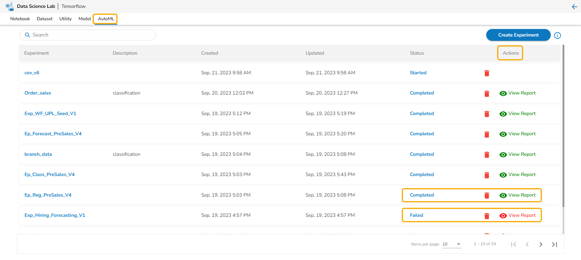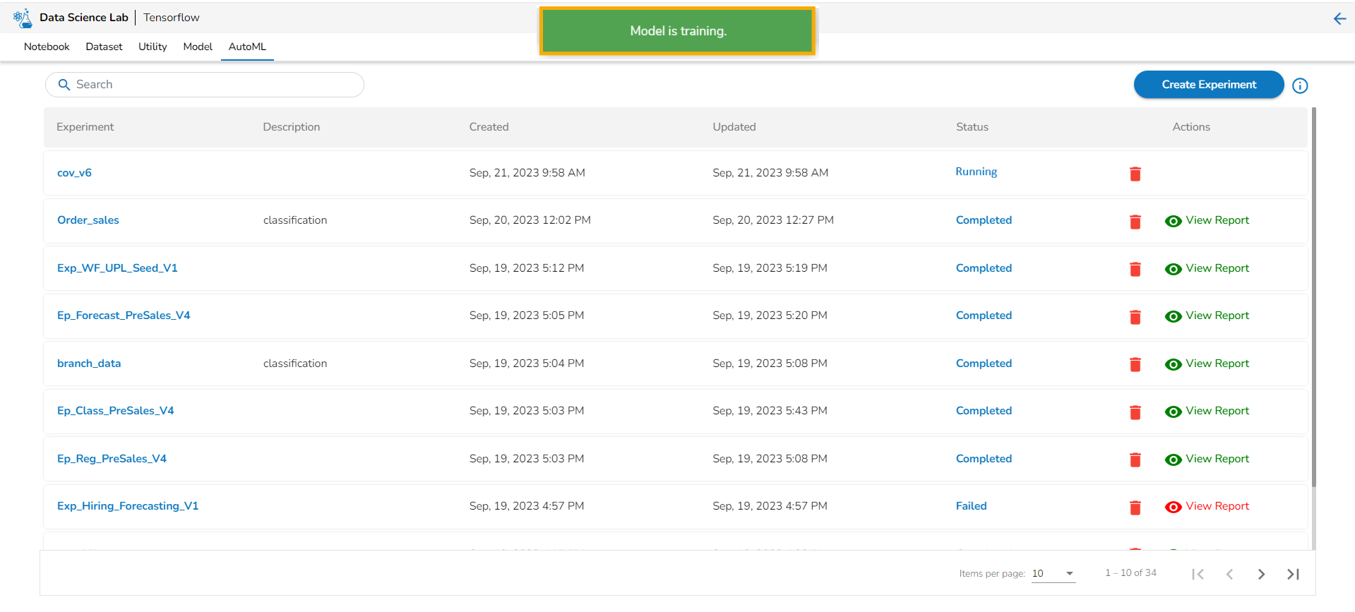 The user gets redirected to the Auto ML tab. All the created Experiments will get listed.