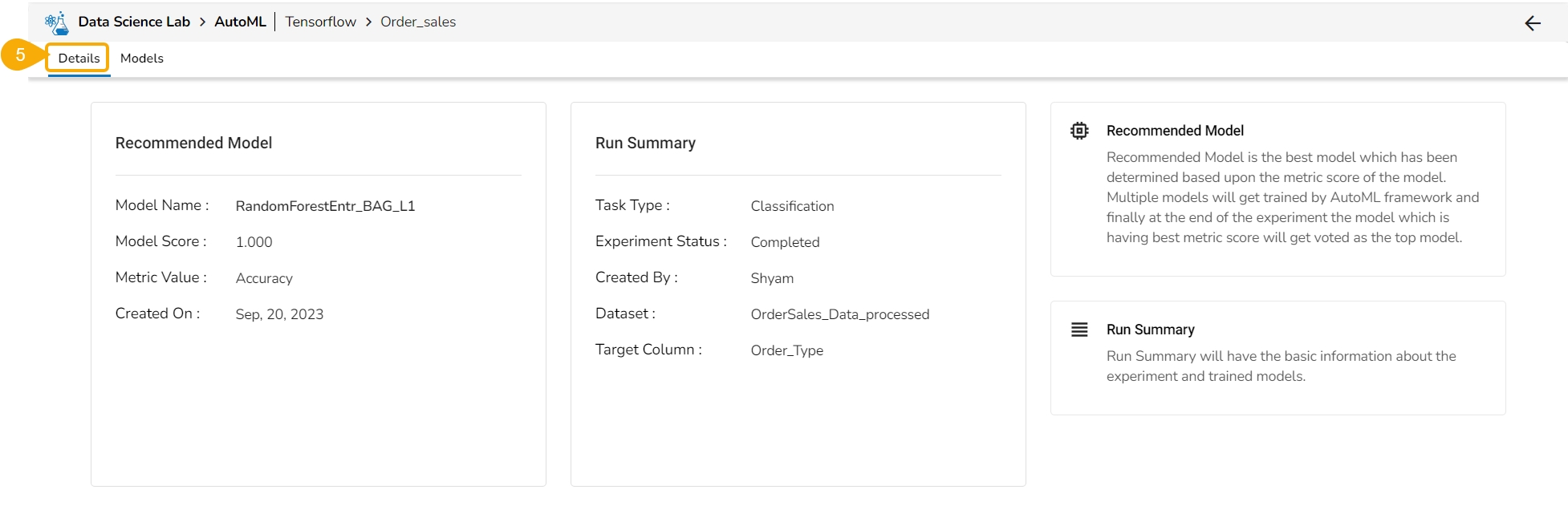 This option provides the summary of the experiment (completed or failed) along with the details of the recommended model (in case of a completed experiment).