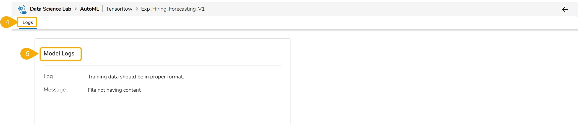 If the user opens the View Report option for a failed Experiment, it will display the Model Logs and mentions the reason of the failure for the model.