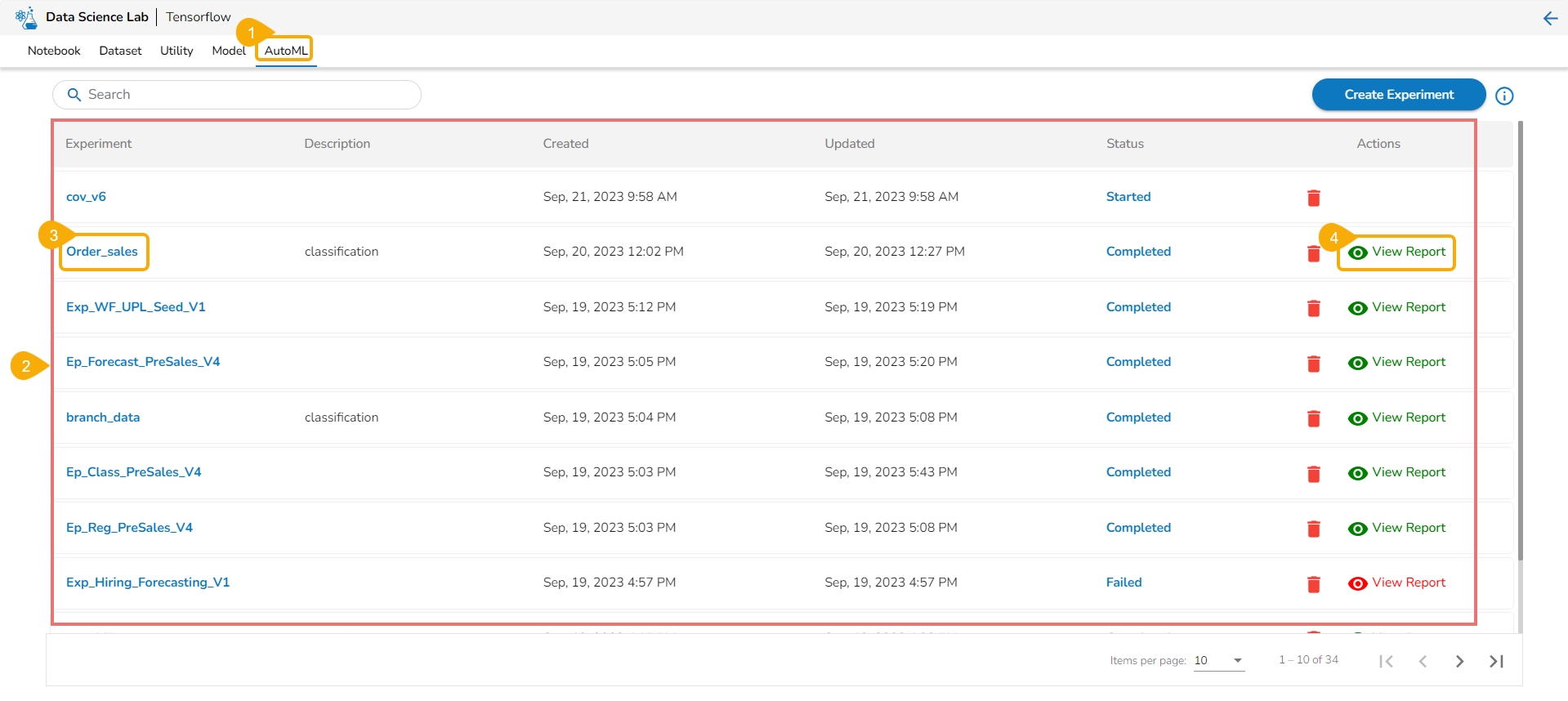 All the created Experiments will get listed.