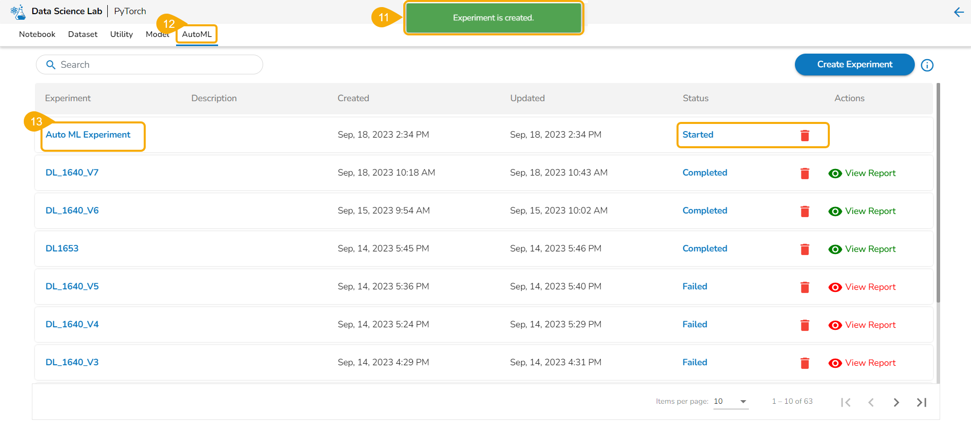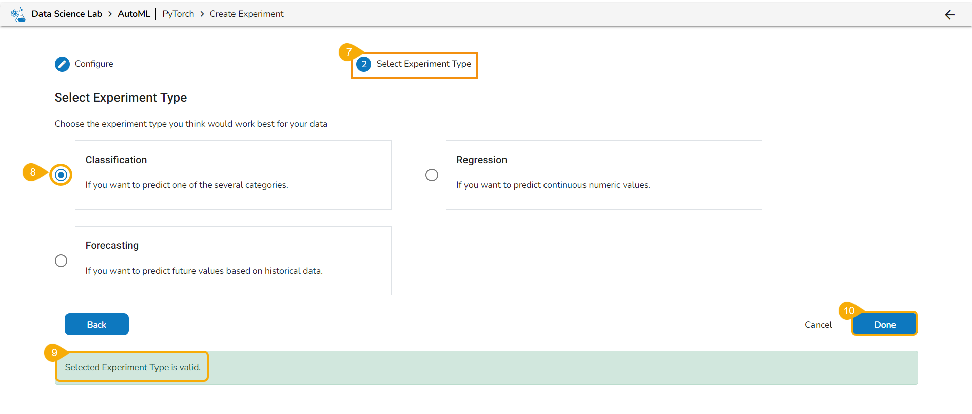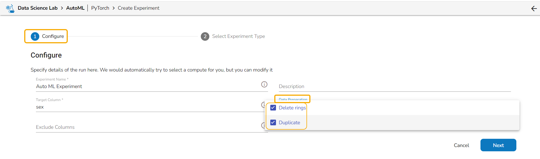 Creating an Experiment is a two-step process that involves configuration and selection of the algorithm type as steps.