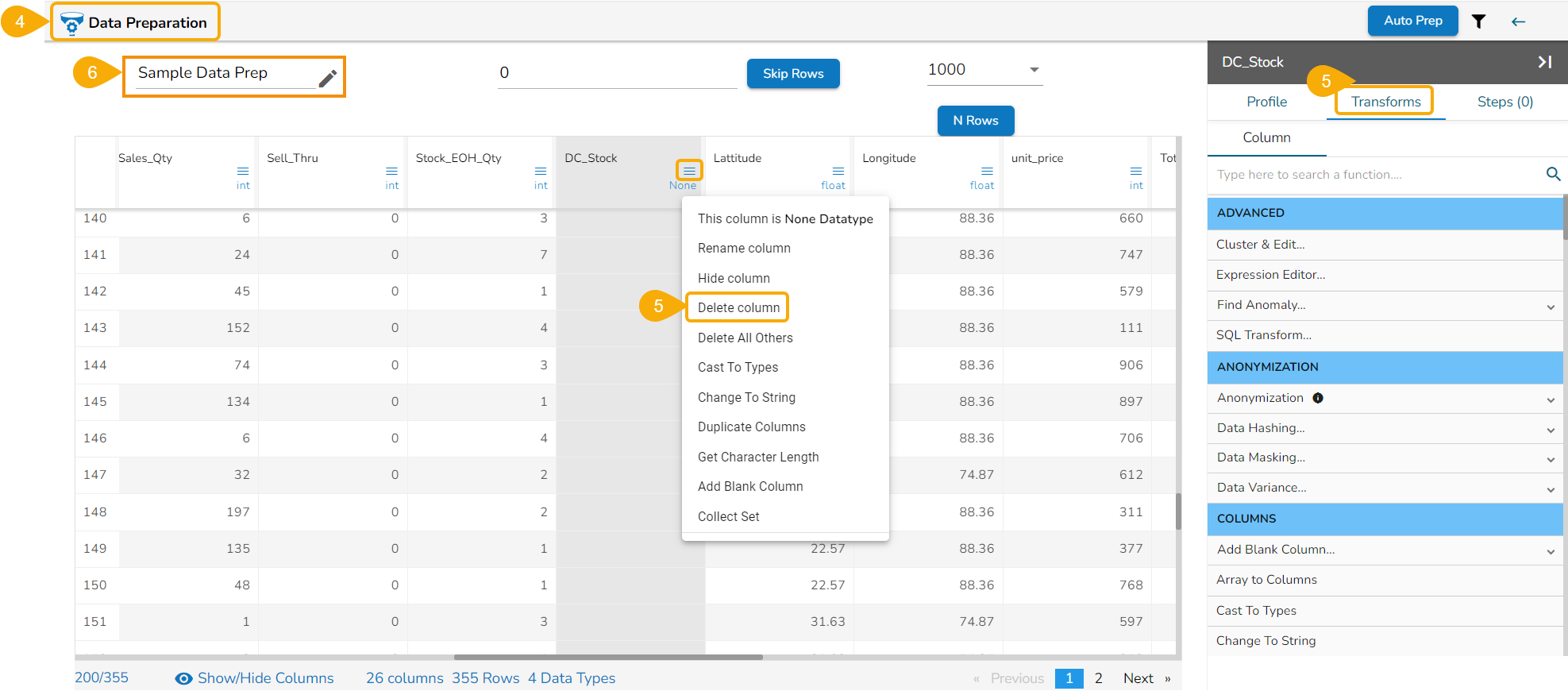 Apply the required transforms on the data set. E.g., There is an empty column in this dataset. The user can either select the Delete column option from the column context menu or choose it from the Transforms tab.
