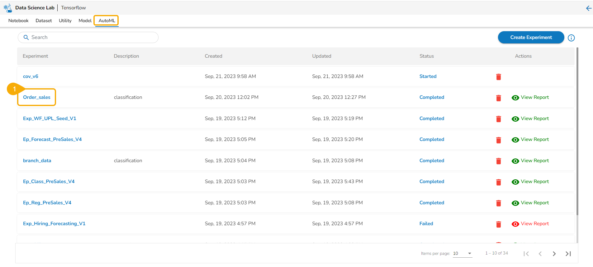 • The user gets to see the same Auto ML experiment listing under the Model List.