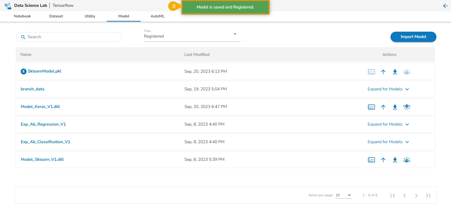 The model gets saved and registered as an API service. A notification message appears to inform the same.