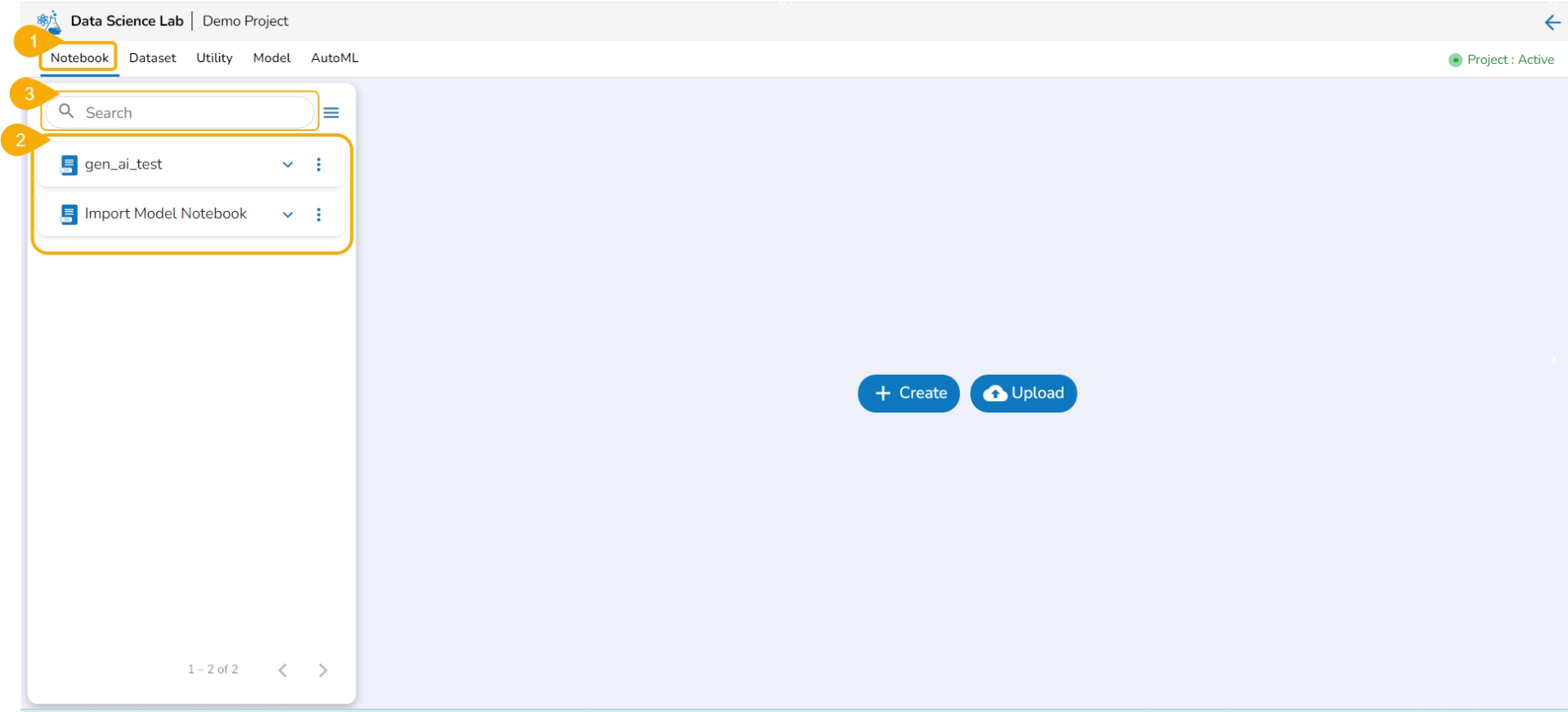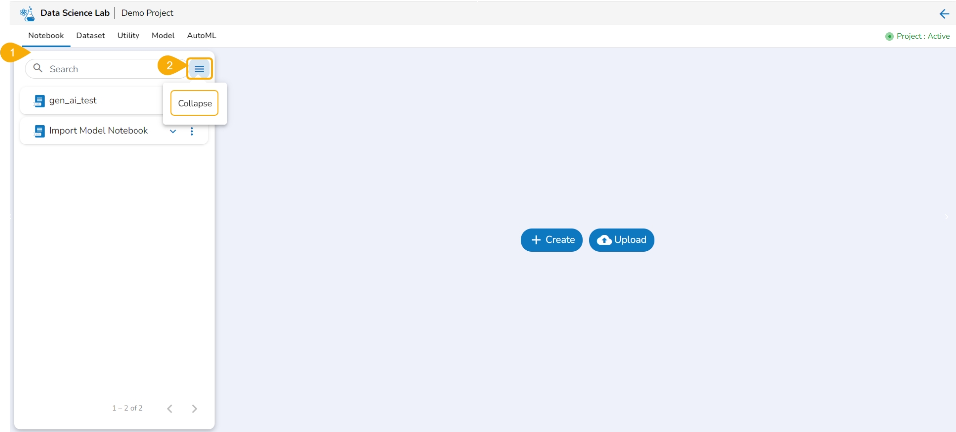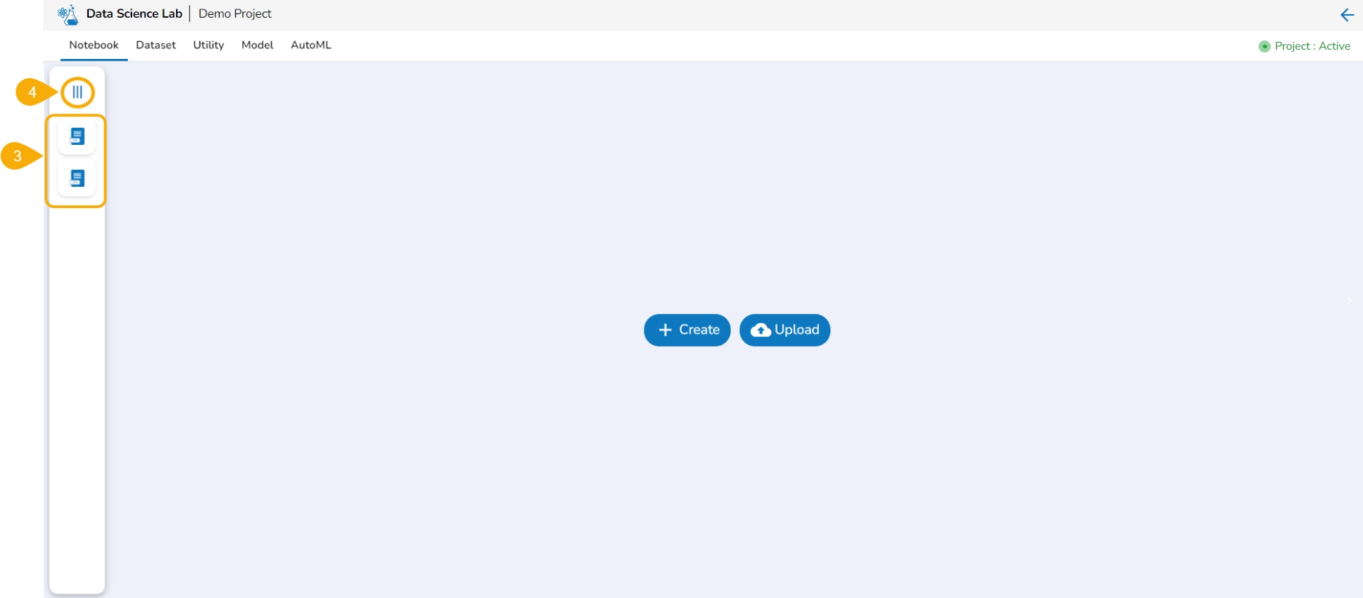 The Notebook List gets created on the left side of the Notebook interface. All the created and saved Notebooks will be listed here with Actions icons.