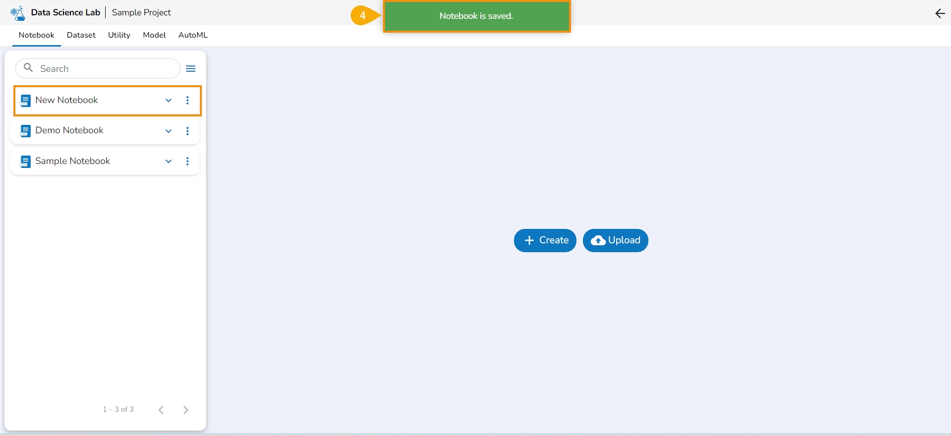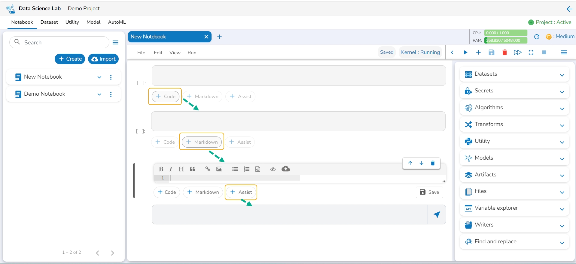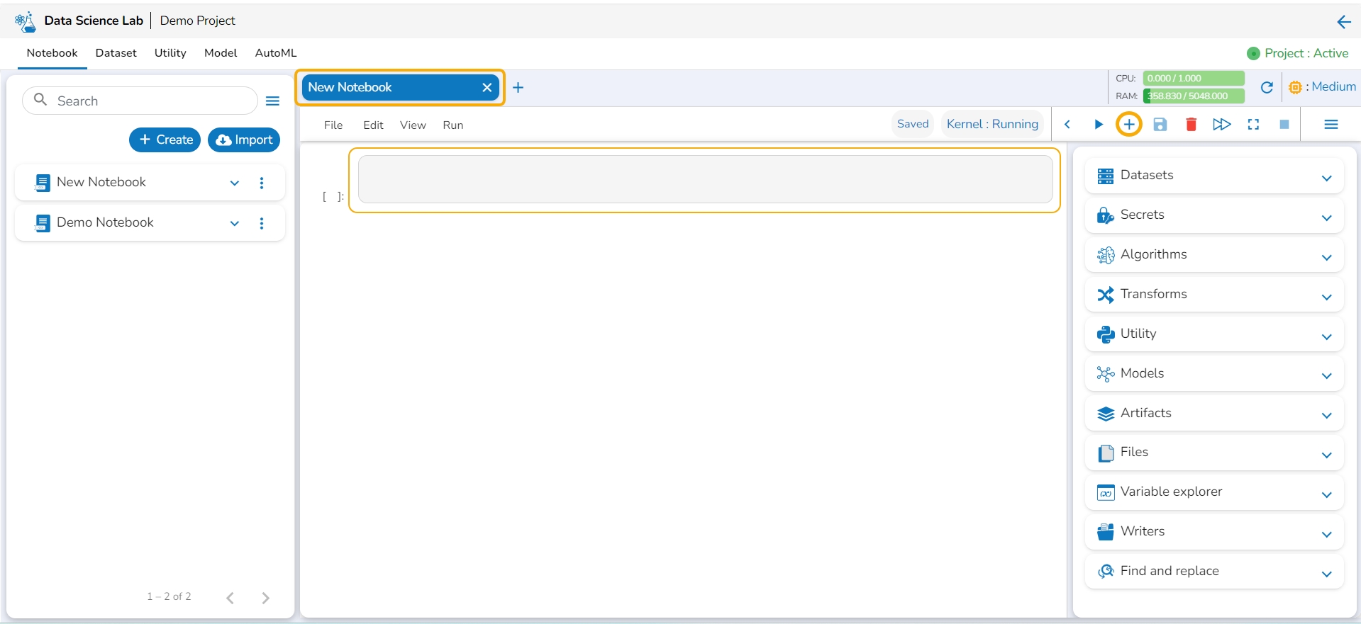 A Notebook under the Data Science Lab module is a collection of cells. These cells contain either explanatory text (Markdown) or executable code and its output.