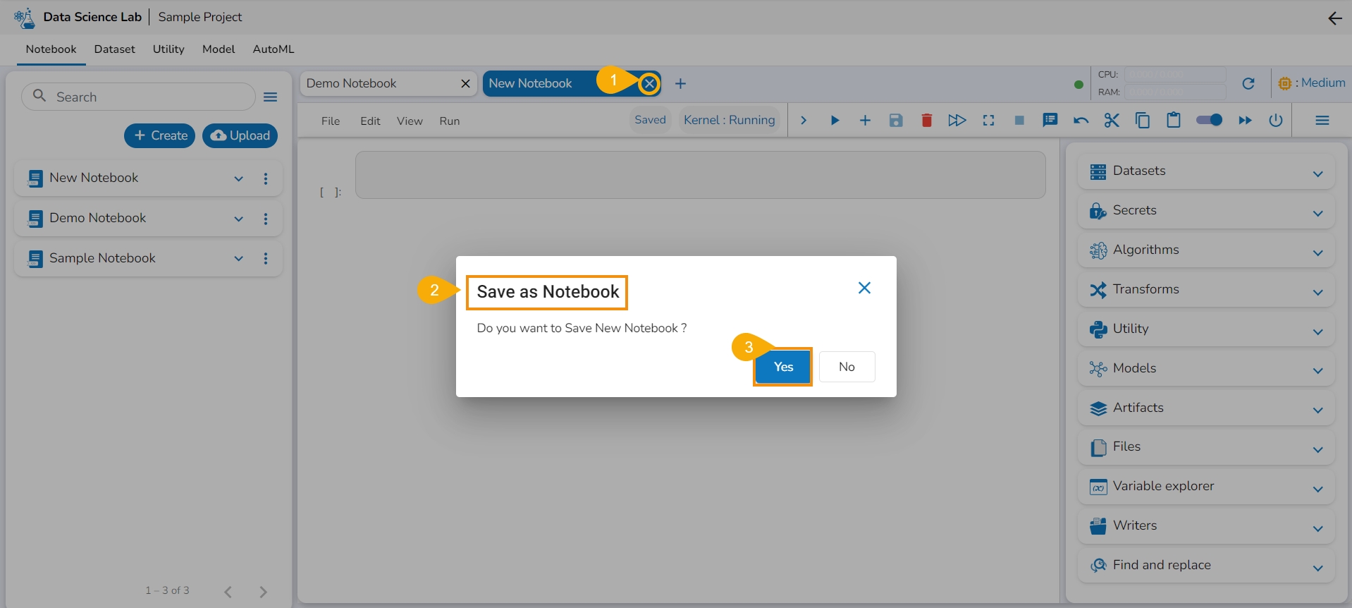 A dialog box opens each time to save the recent changes from the user while closing the selected opened Notebook at any given time. The user can click the Yes option to save the Notebook.