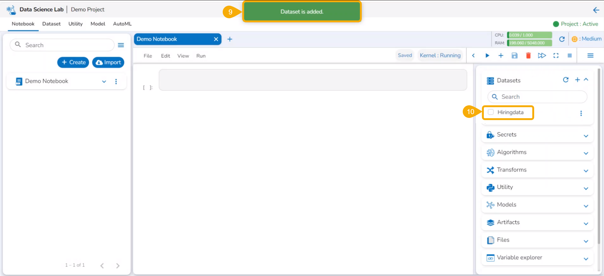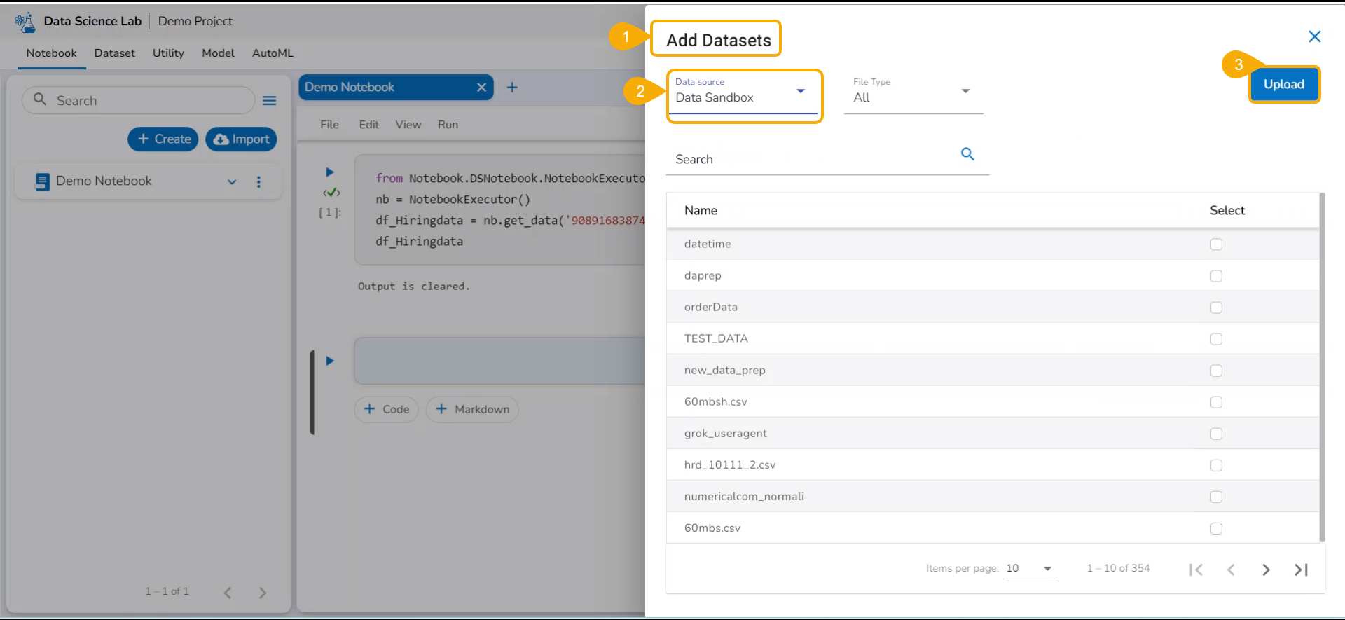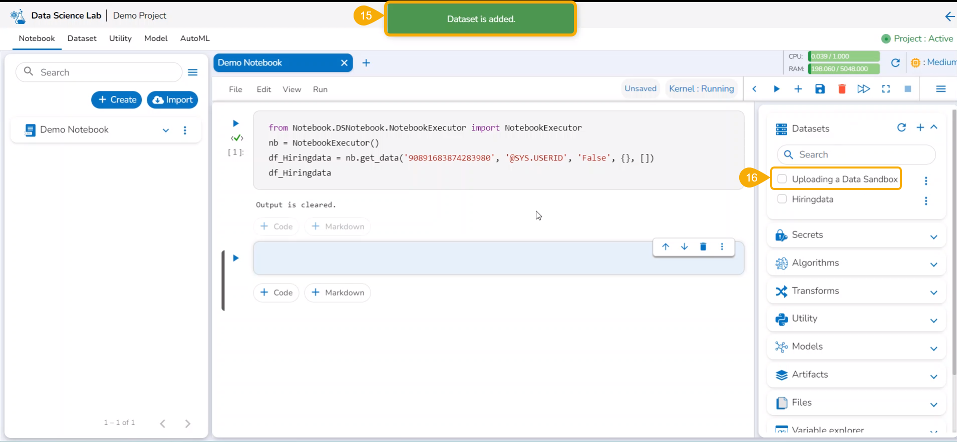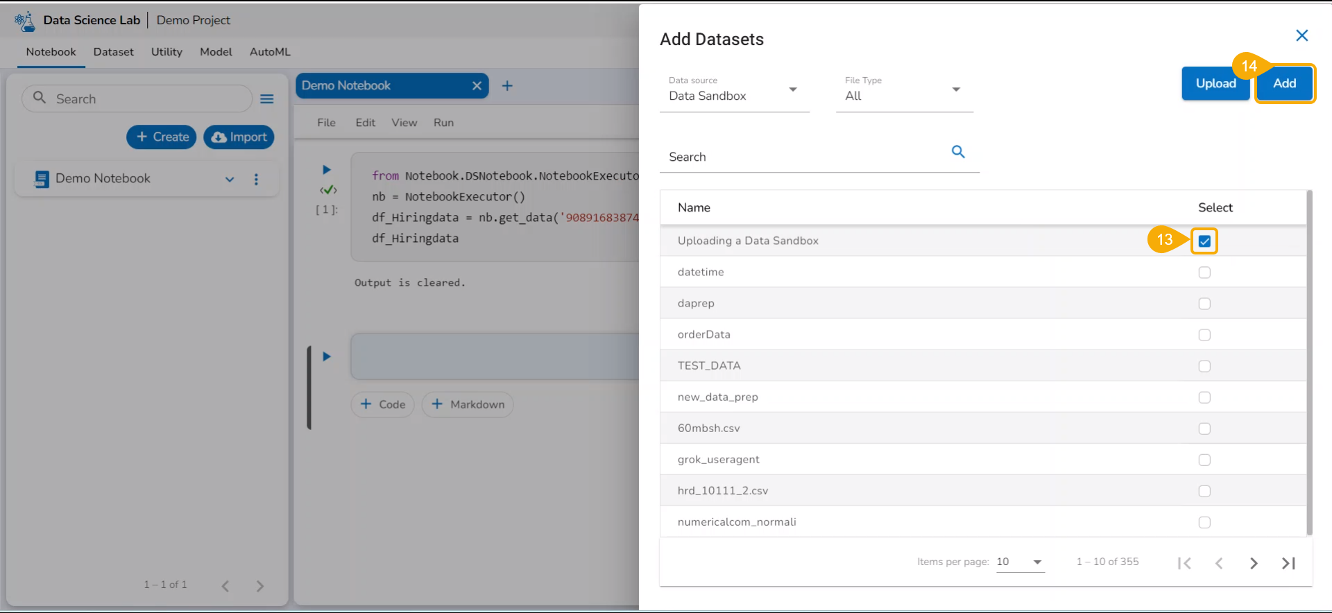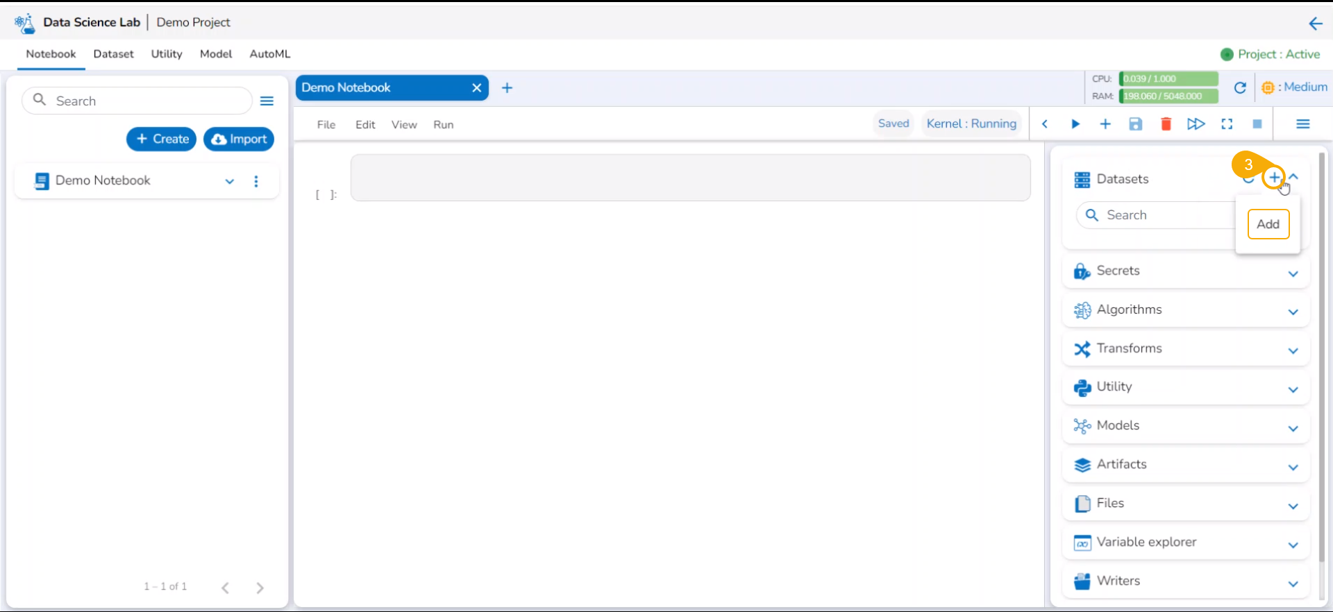 Now the Notebook page facilitates the user to add the datasets.