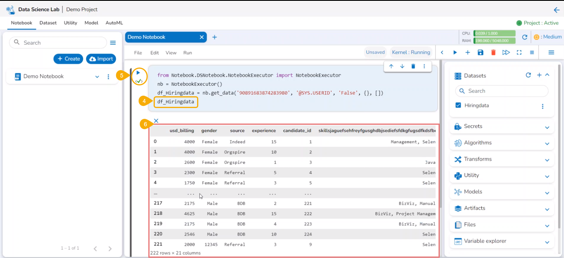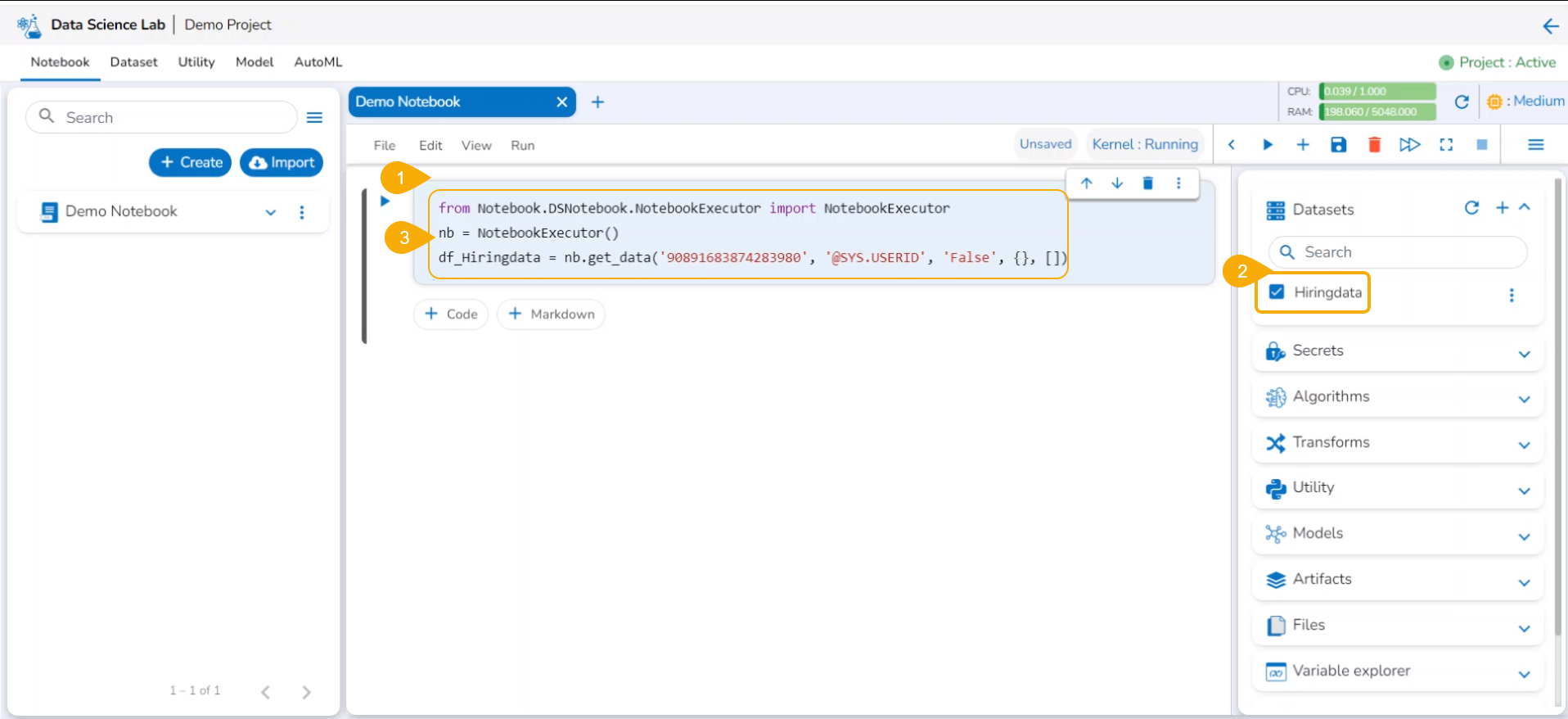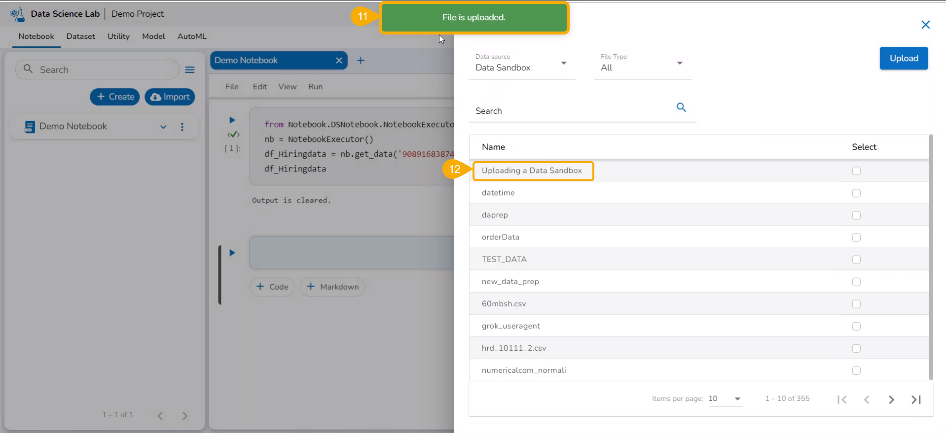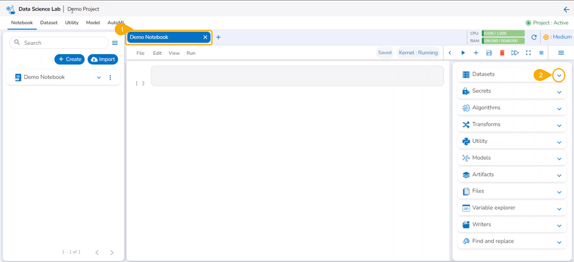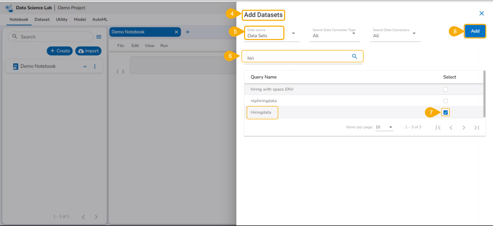 Now the Notebook page facilitates the user to add the datasets.