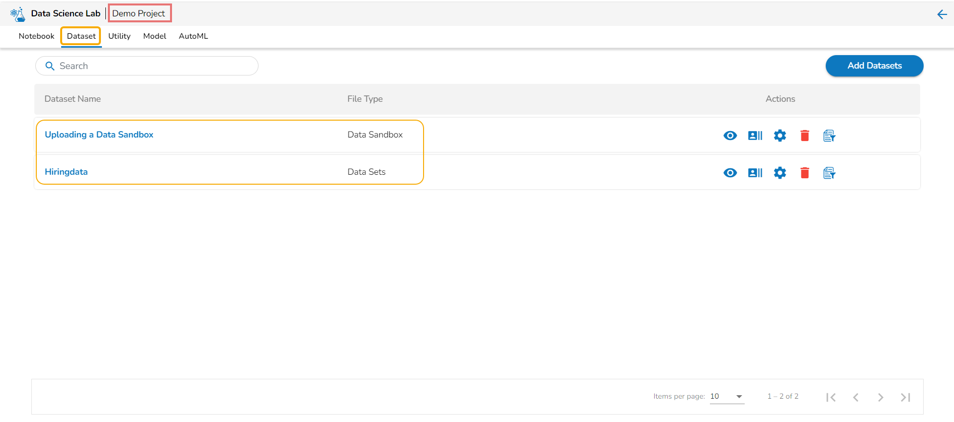 Project Level Dataset Tab