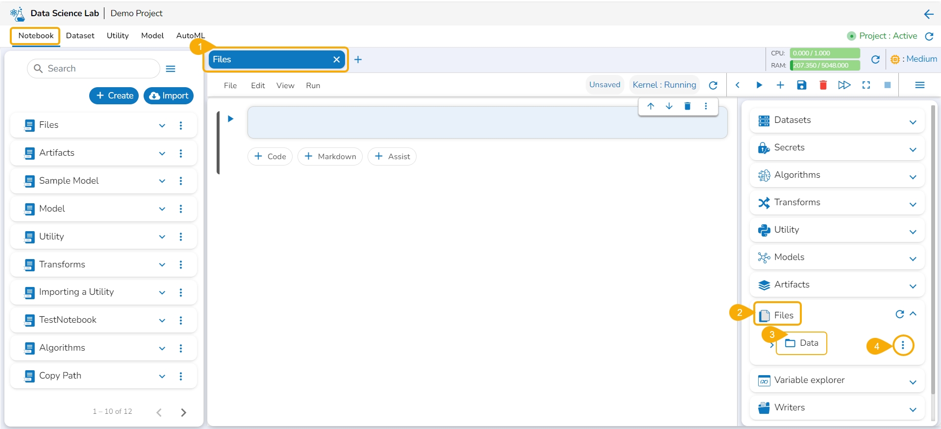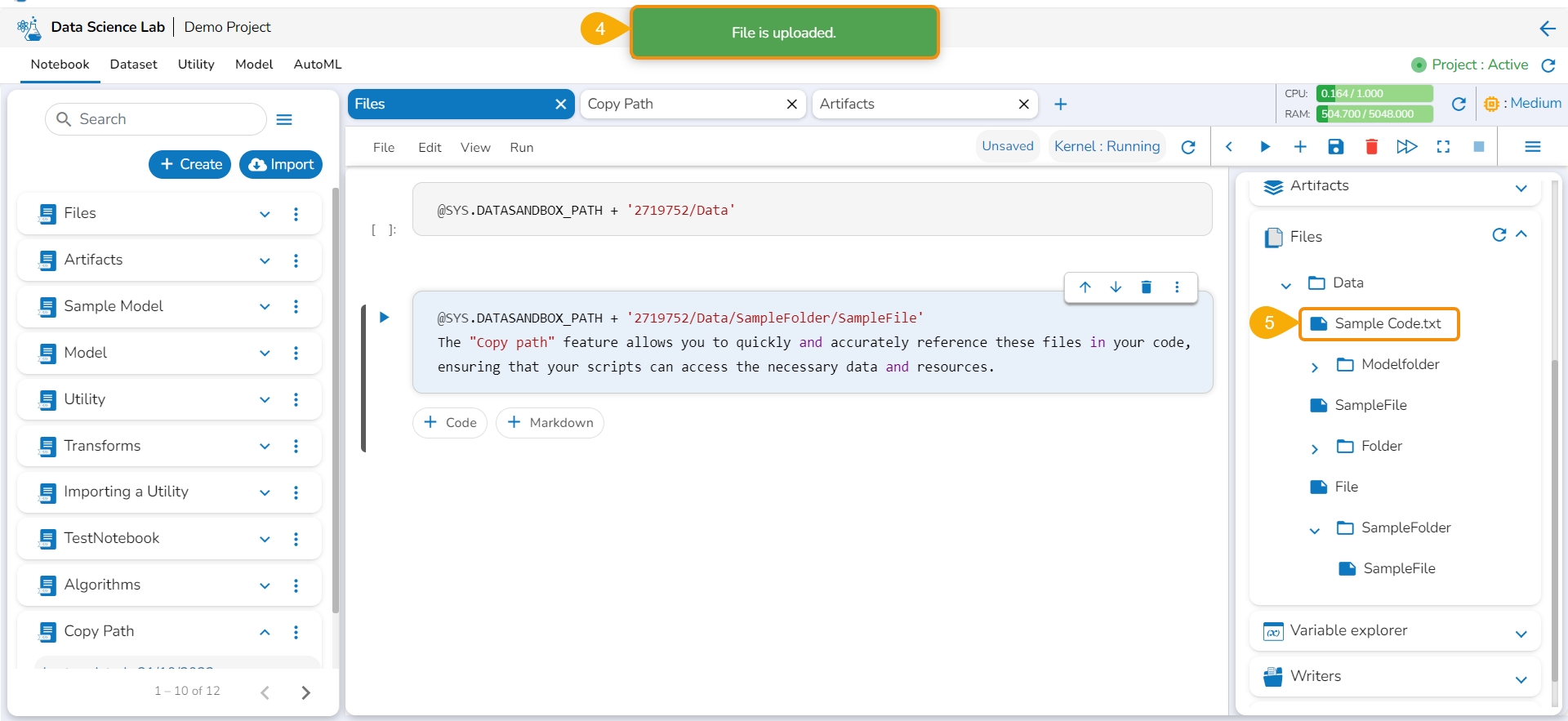 Users will be allotted a Data folder in each Data Science Lab project to create files, folders and upload a file into the dedicated Data Sandbox location