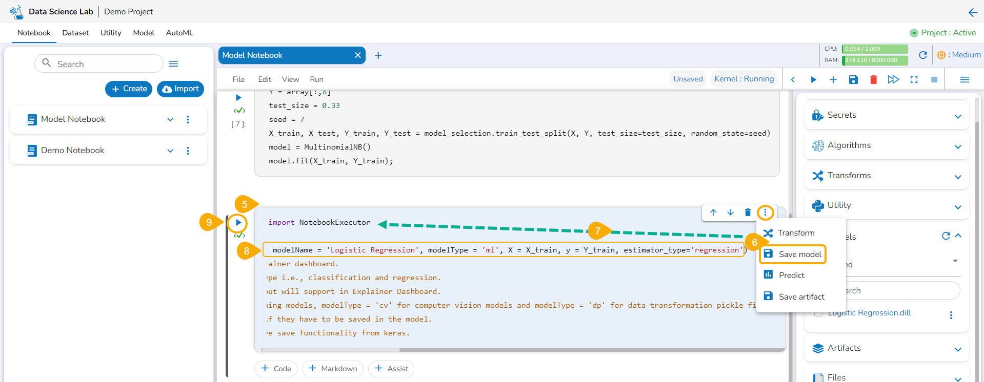 Save the Data Science Model by defining a name and specifying the X, y and estimator_type.