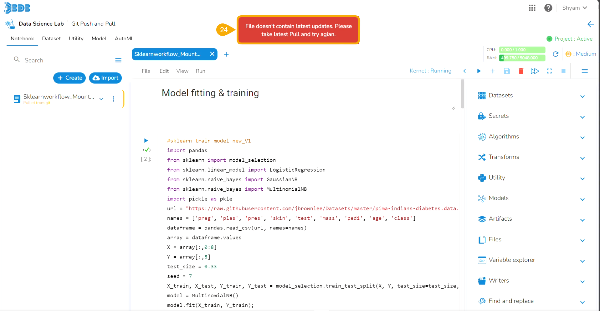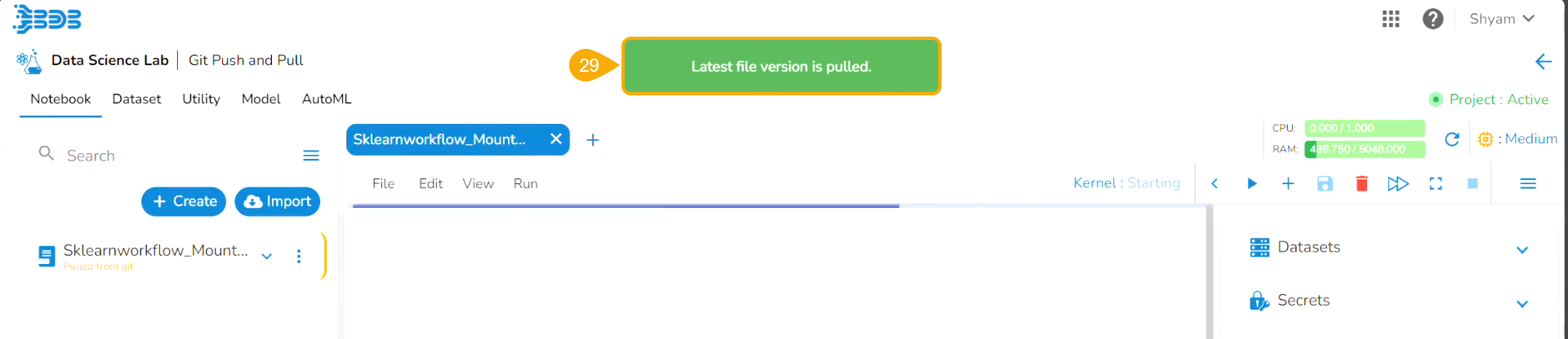 Another notification message appears to inform the user that the pulled Notebook is started.