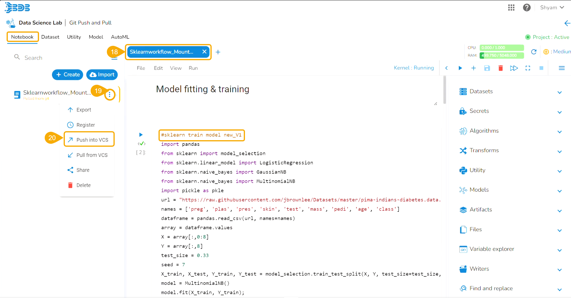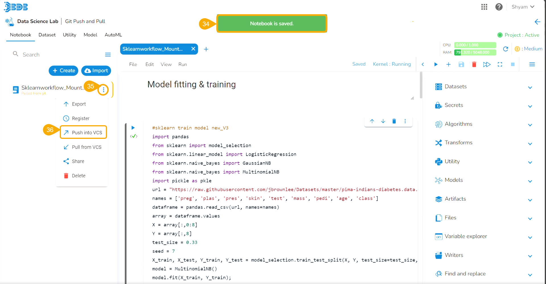 Click the Push into VCS option for the selected Notebook.