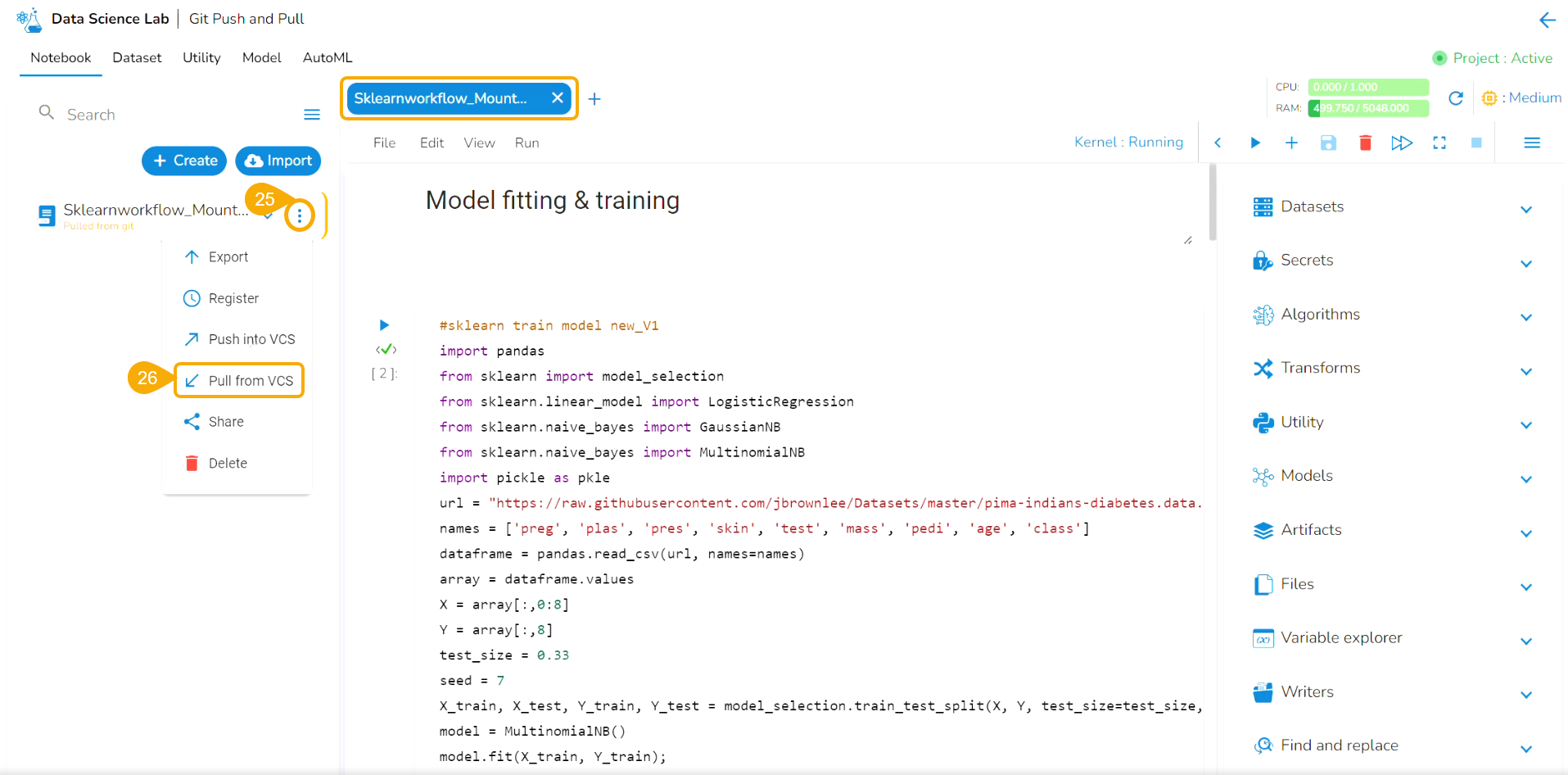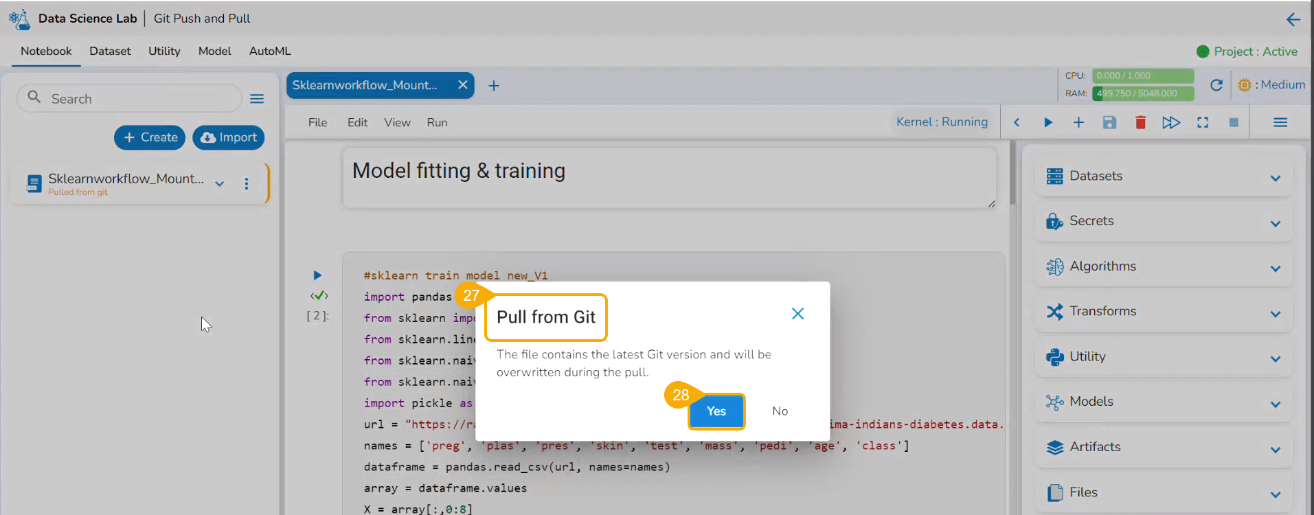 Projects and Branches created in GitLab/GitHub can be accessed using the access token inside the DS Lab and the files (.ipynb) can be pulled using the Pull from Git functionality.