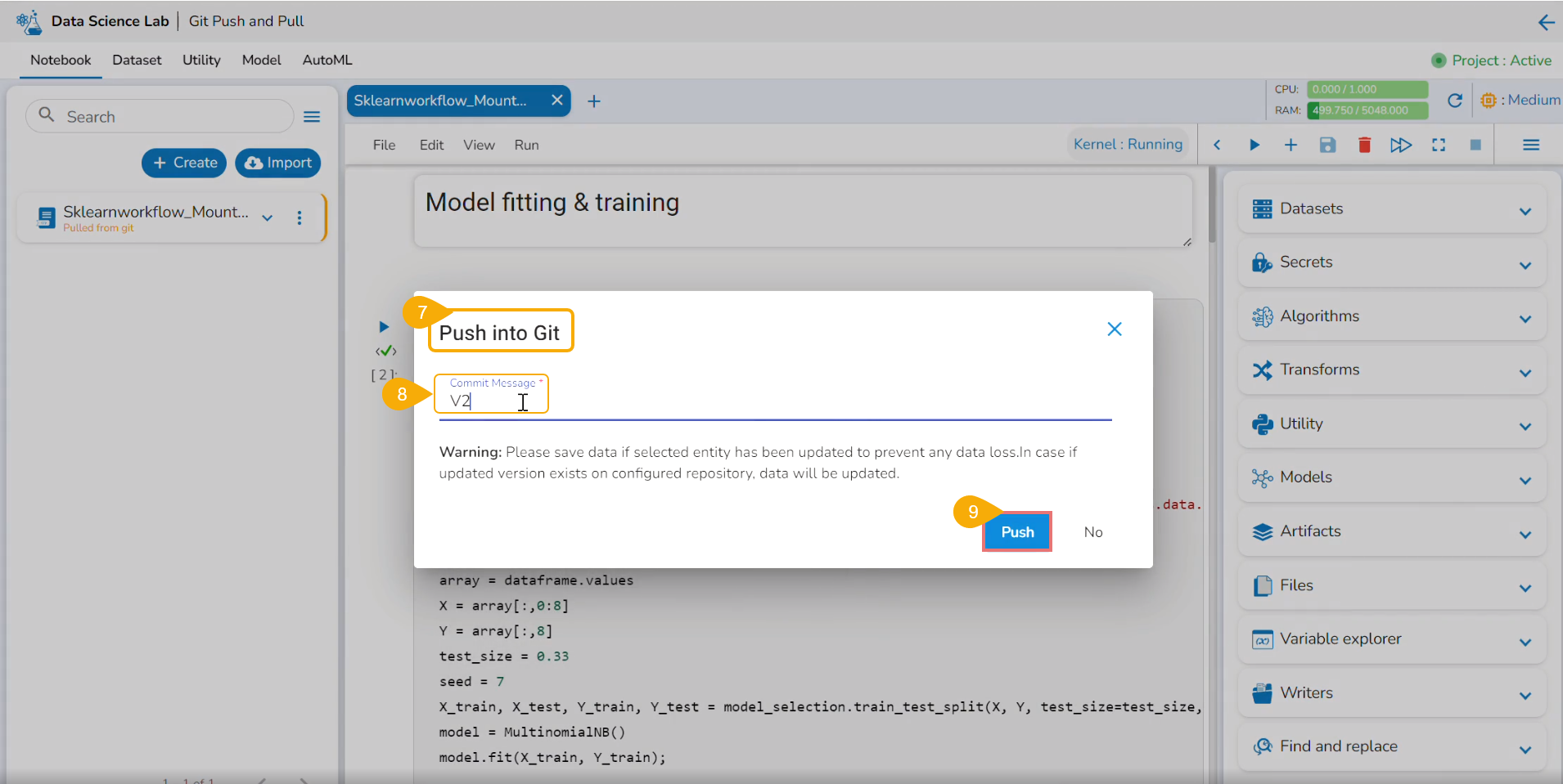 A notification message appears to ensure that the latest file version is pushed (to Git).