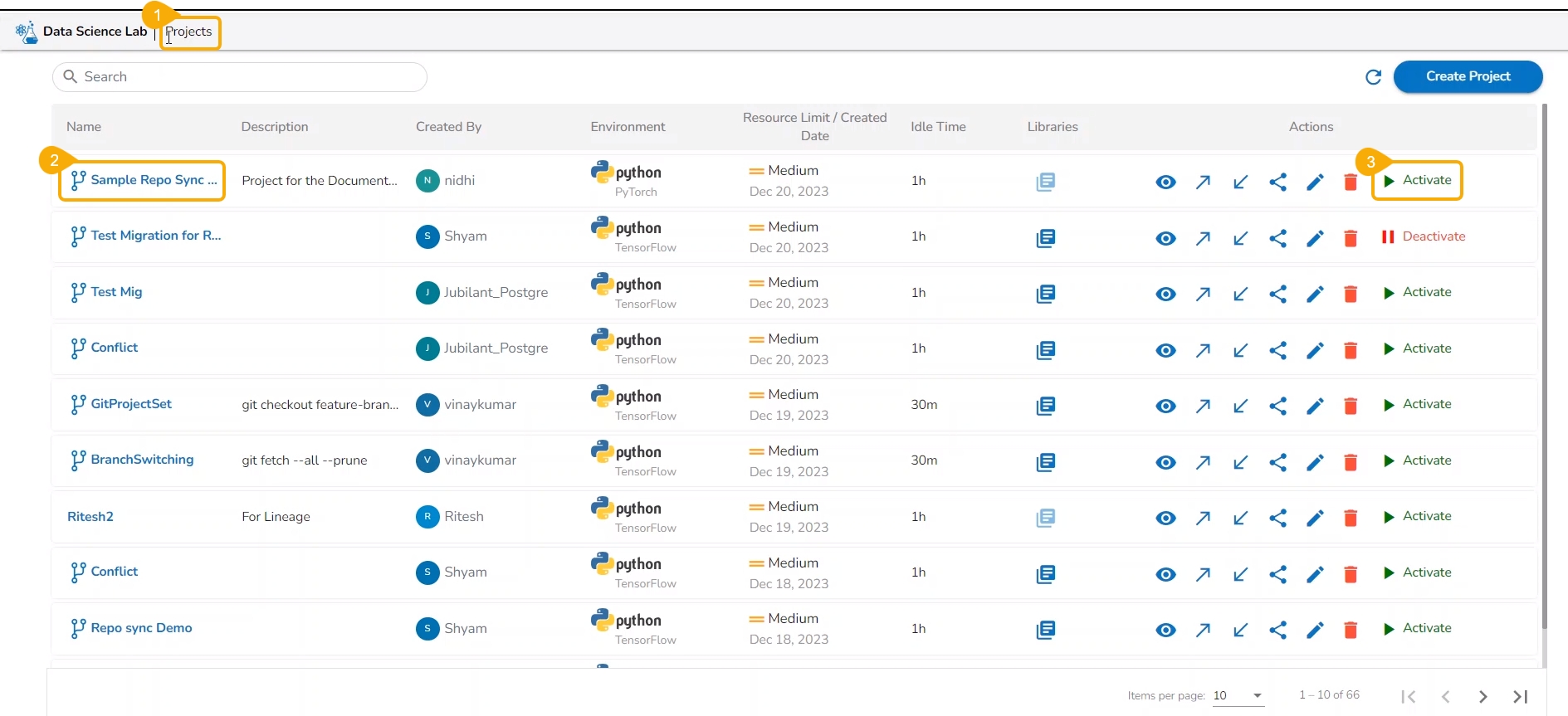 The Activate option gets changed into the Deactivate option for the concerned project.