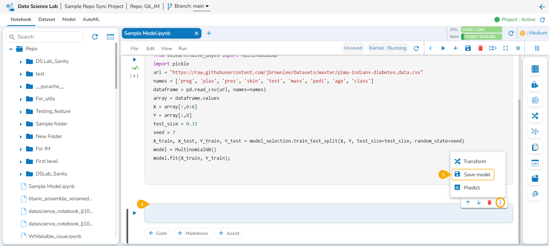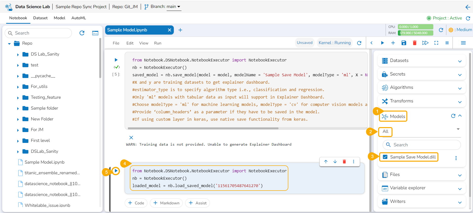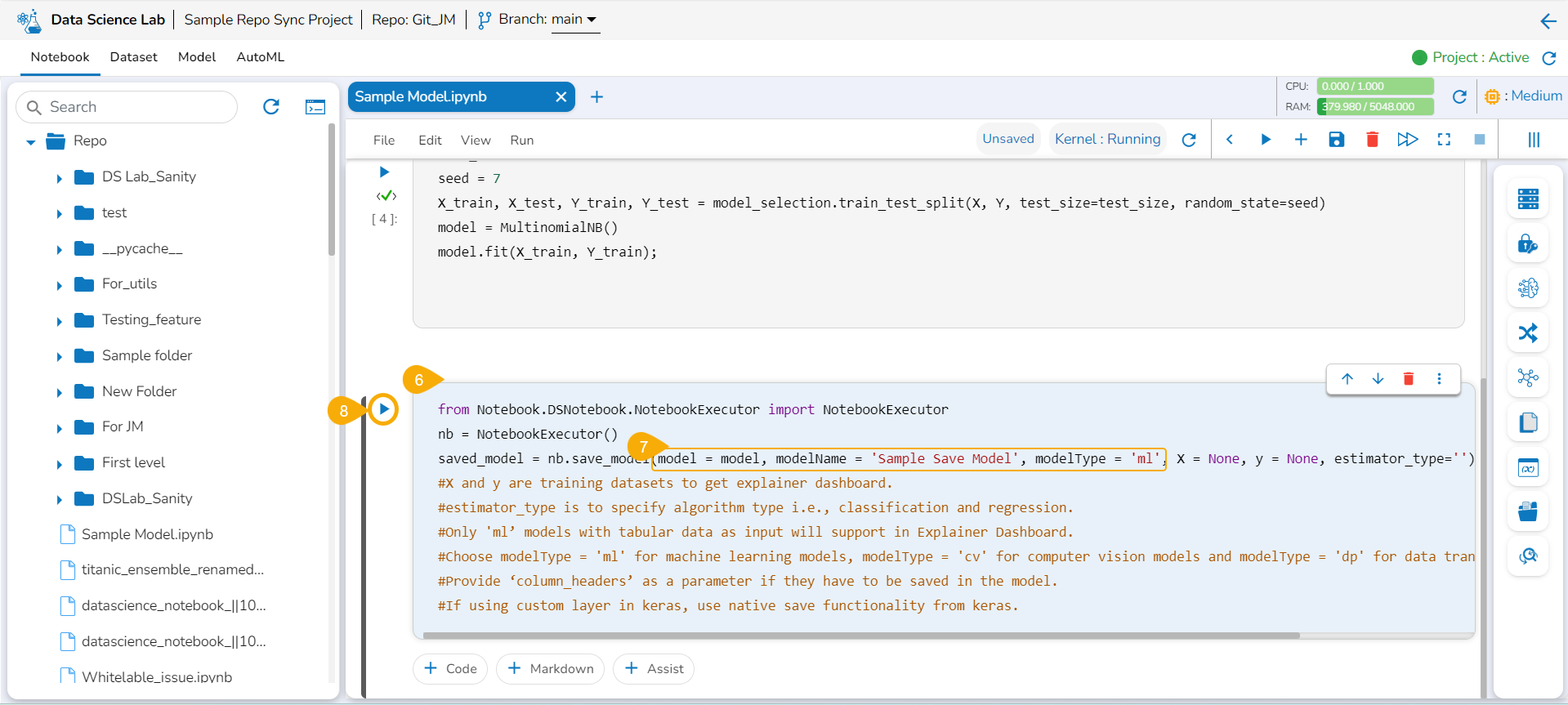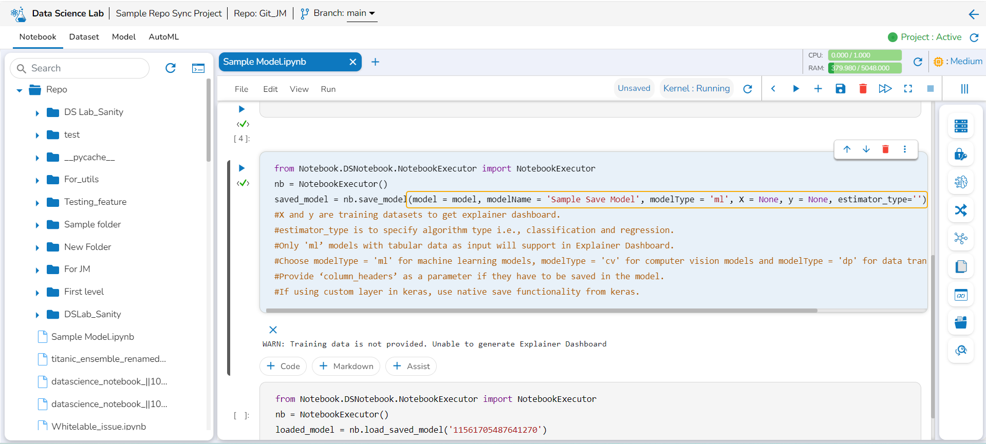 Once the Notebook script is executed successfully, the users can save them as a model. The saved model can be loaded into the Notebook.