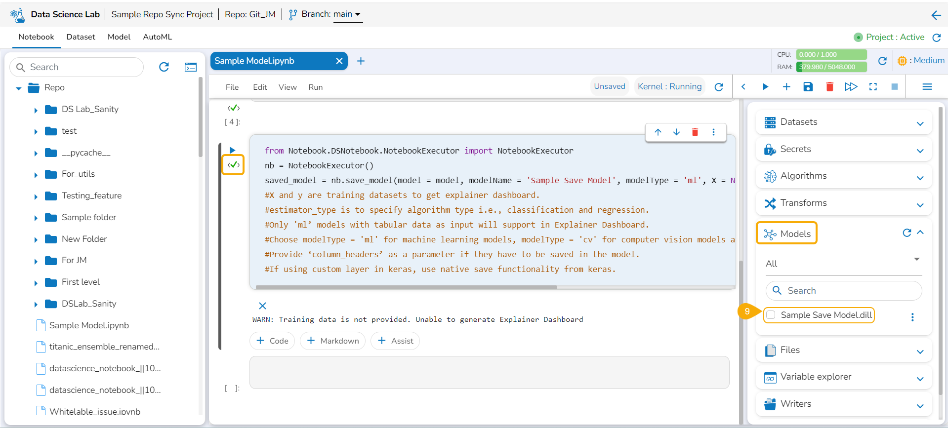 * After the code gets executed, the Model gets saved under the ***Models*** tab.