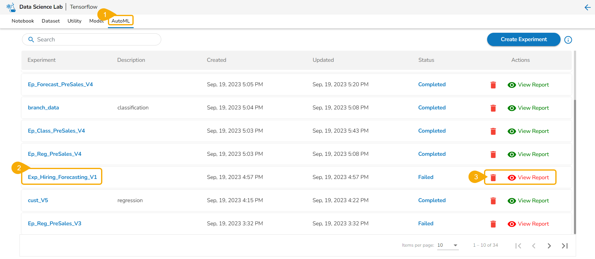 • All the created Experiments will be listed.