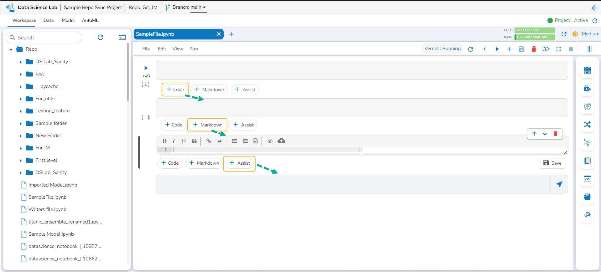 You can add new cells by using the +Code, +Markdown, and +Assist options given at the bottom of the cell.